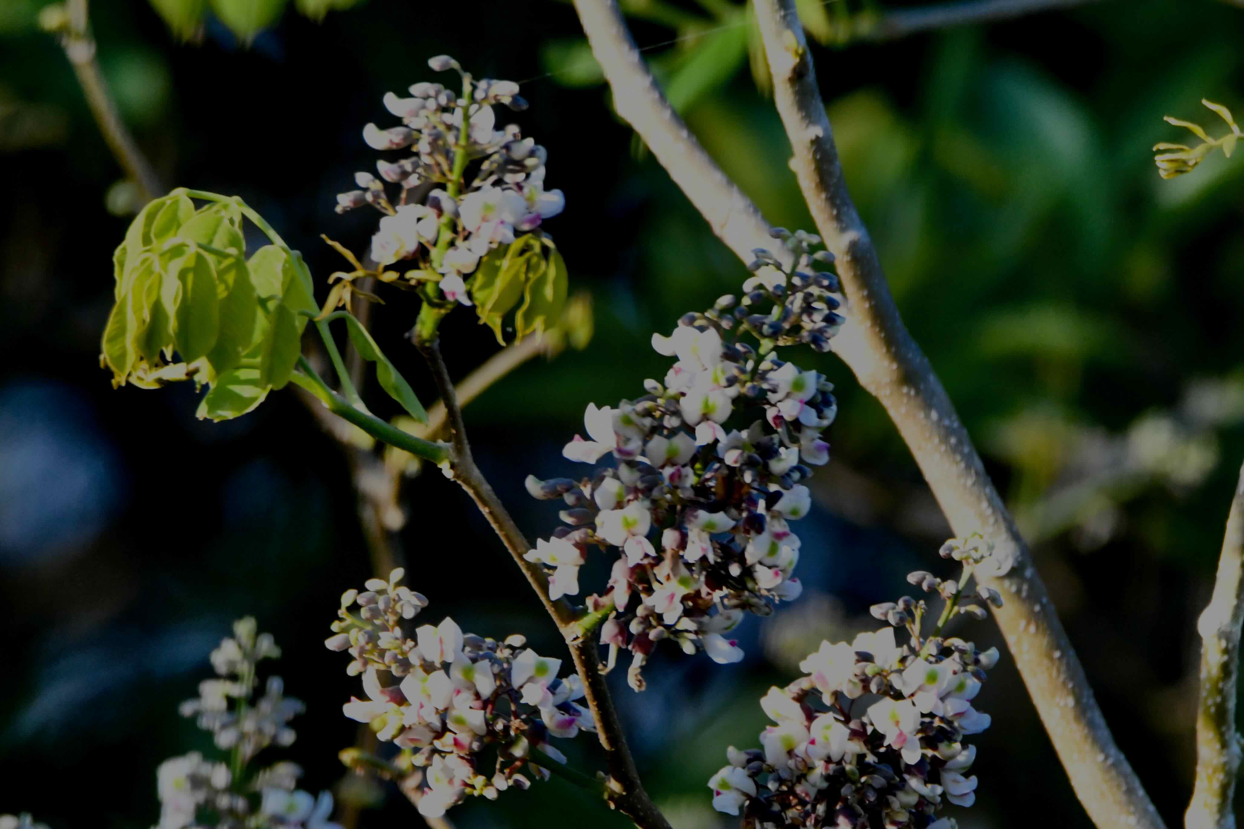 The flowers themselves are white, with a tinge of pink or lavender, and appear in large clusters. The fruit is a papery seed pod that appears July into September. It turns from green to light brown as it matures.