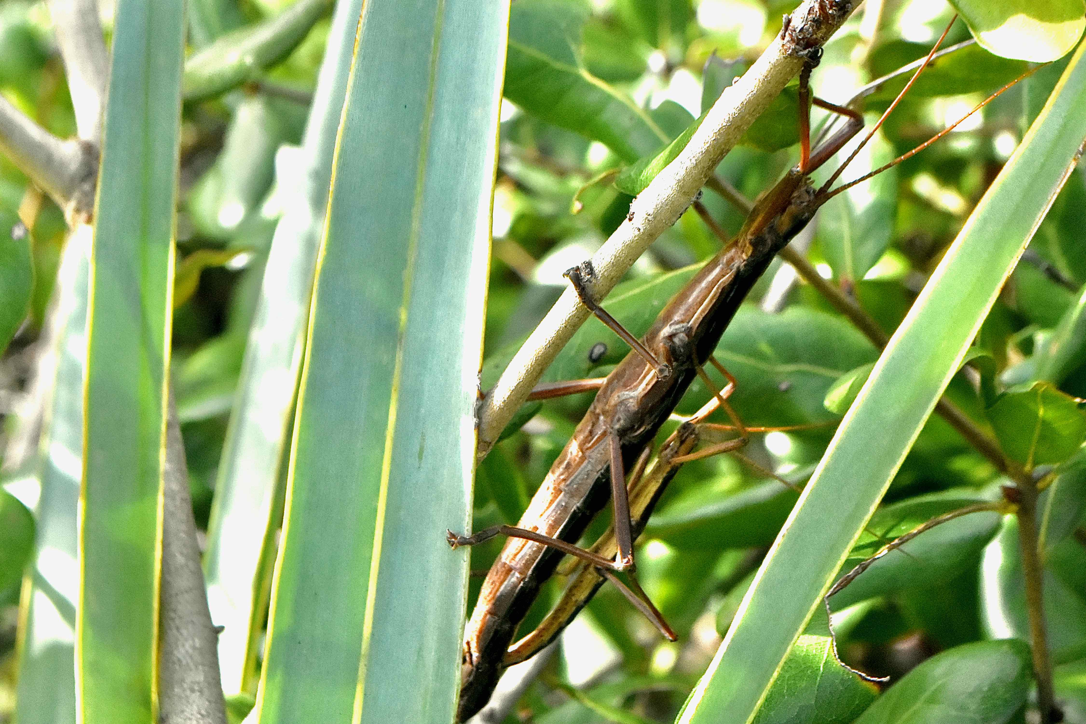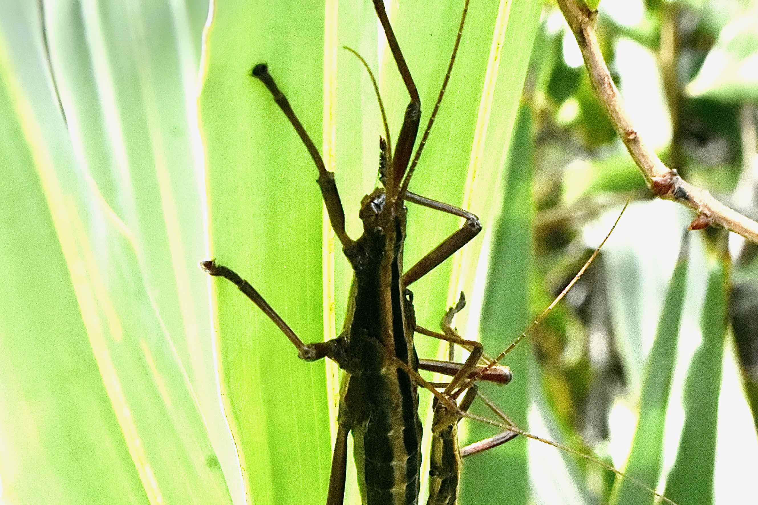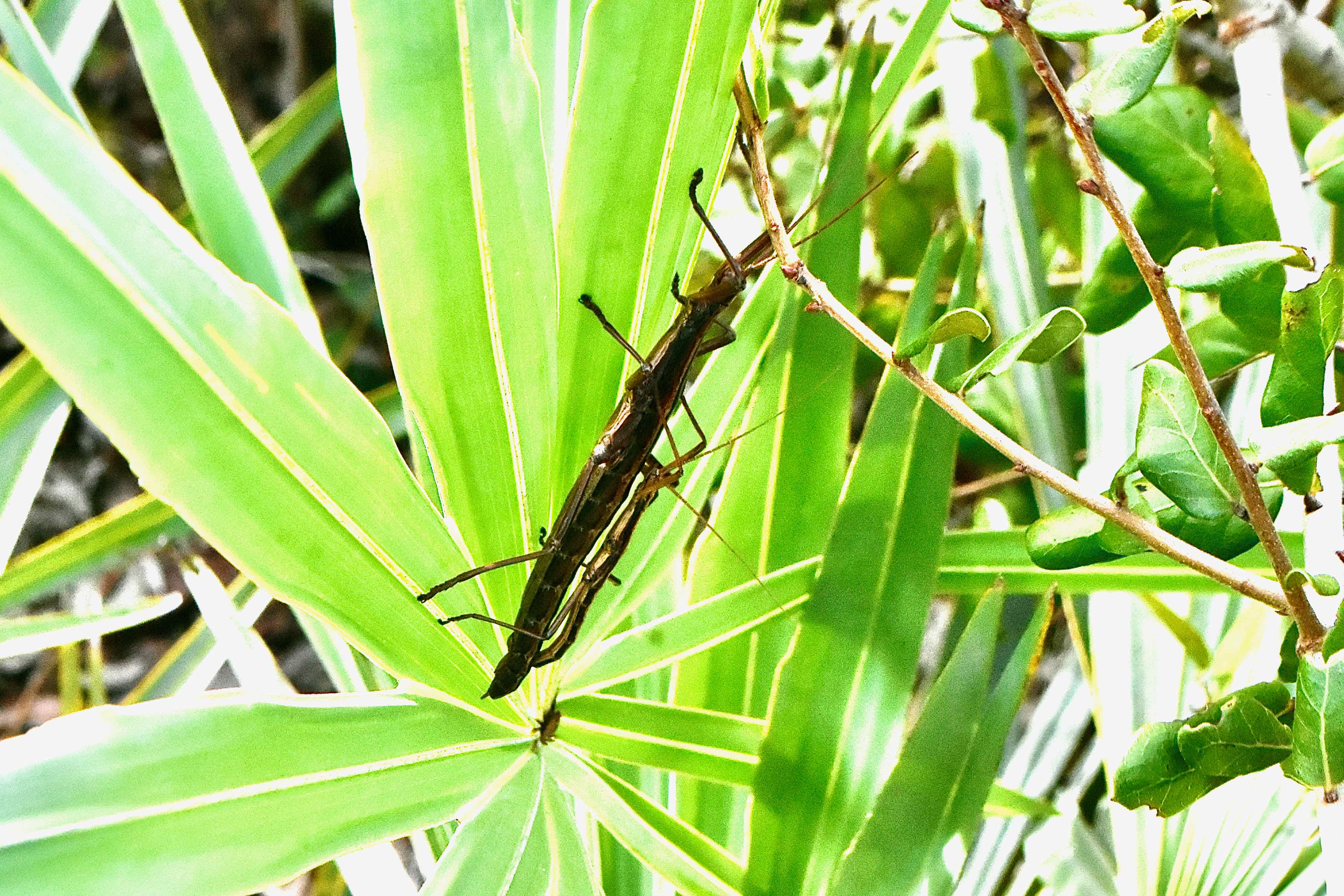Note: Our guy is often called the southern two-striped walking stick to distinguish him from a similar-looking cousin, scientifically known as Anisomorpha ferruginea, the northern two-striped walking stick. The northern, which is smaller and paler, is not found in Florida.