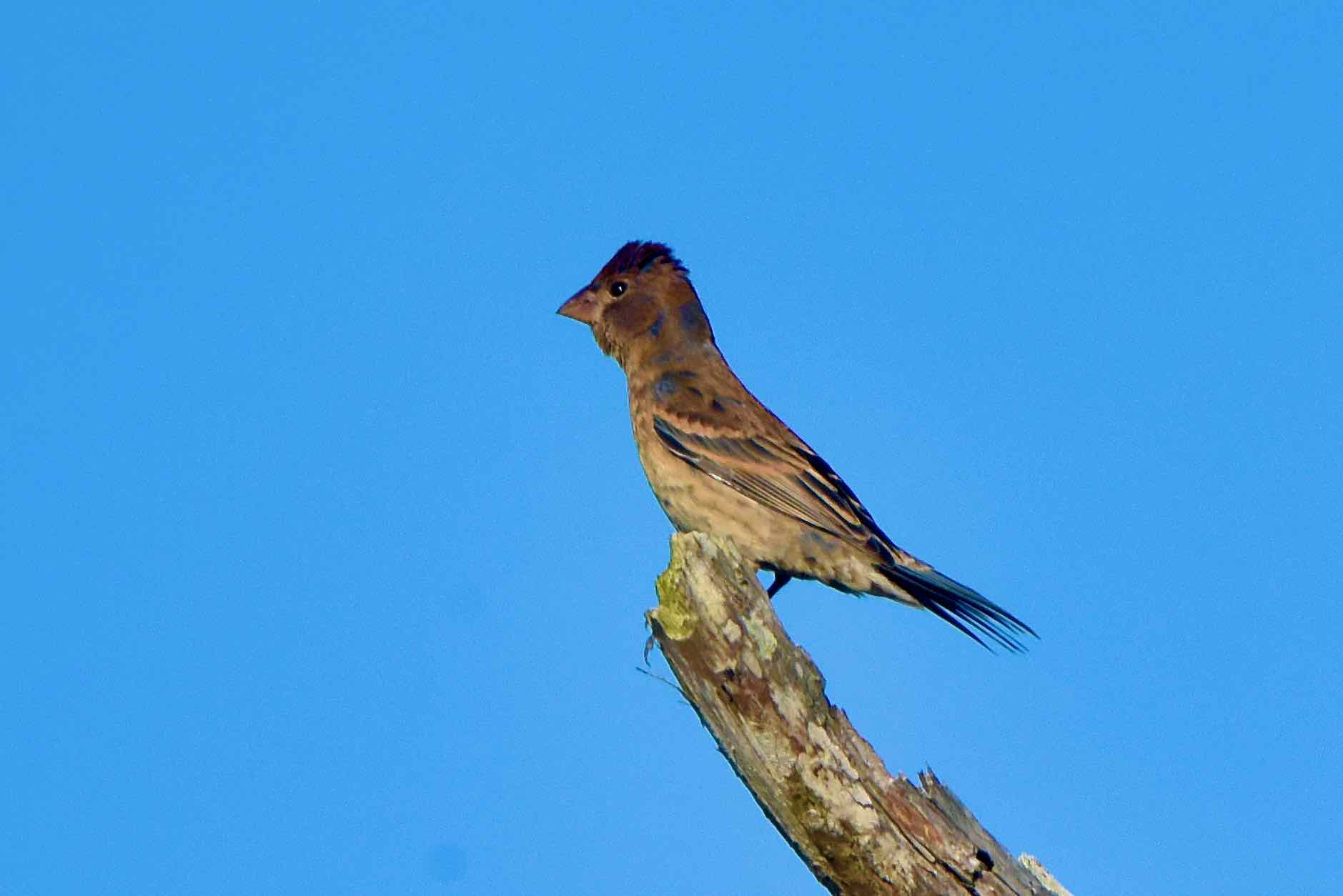The males are brilliant blue with a black face mask and two prominent cinnamon bars in the wings, mixed in with lighter blues and blacks. The bill is large, thick and angular like its cousin, the northern cardinal, and silver in color. A slight, cardinal-like crest is evident at times atop the head. Females and immature males are a dull mix of browns, but they do sport dark cinnamon wing bars. They are medium in size, about six to six-and-a-half inches long with a wing span of about 11 inches, both sexes the same size. Audubon describes them as “oversized” indigo buntings.