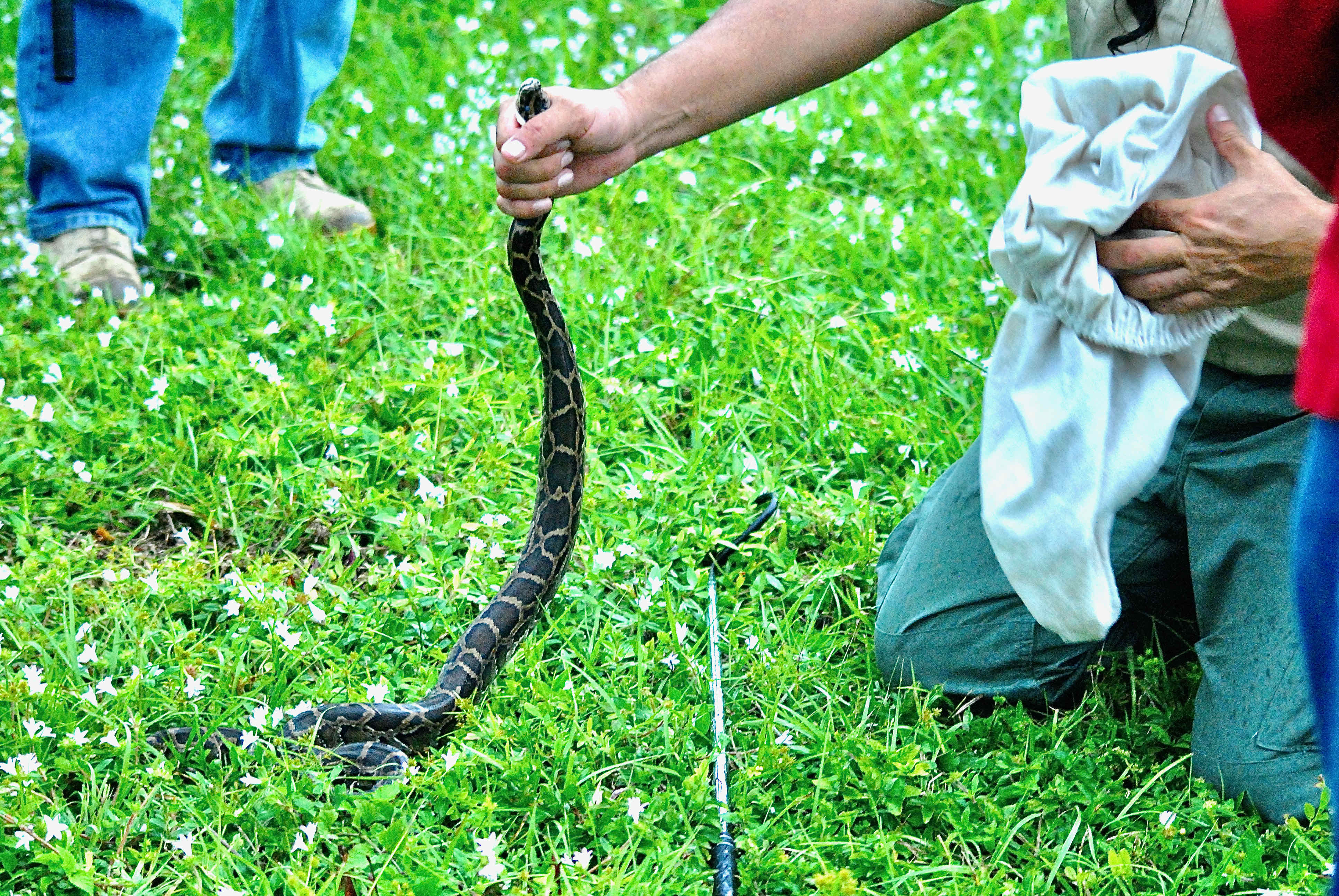 Burmese pythons are excellent swimmers and are often found along canal banks. That means water is no barrier to how far they can spread — they've already been found as far south as Key Largo. They also can climb trees. Early in the morning they tend to move into the open, where they can soak up some sun, particularly in winter. In the evening, they're often seen on roads or rocky outcroppings, again soaking up vital heat before sundown. They are masters at hiding — that's how they hunt, waiting for an unwary morsel to pass by, then quickly striking. They are not venomous, but rather constrictors, grabbing their prey with their mouth, then wrapping themselves around it and essentially suffocating it. Prey could be almost anything, an endangered Key Largo woodrat or the threatened limpkin. White-tailed deer and adult alligators also are on the menu. A python will retreat if they spot a human approaching, but will fight if it feels trapped.