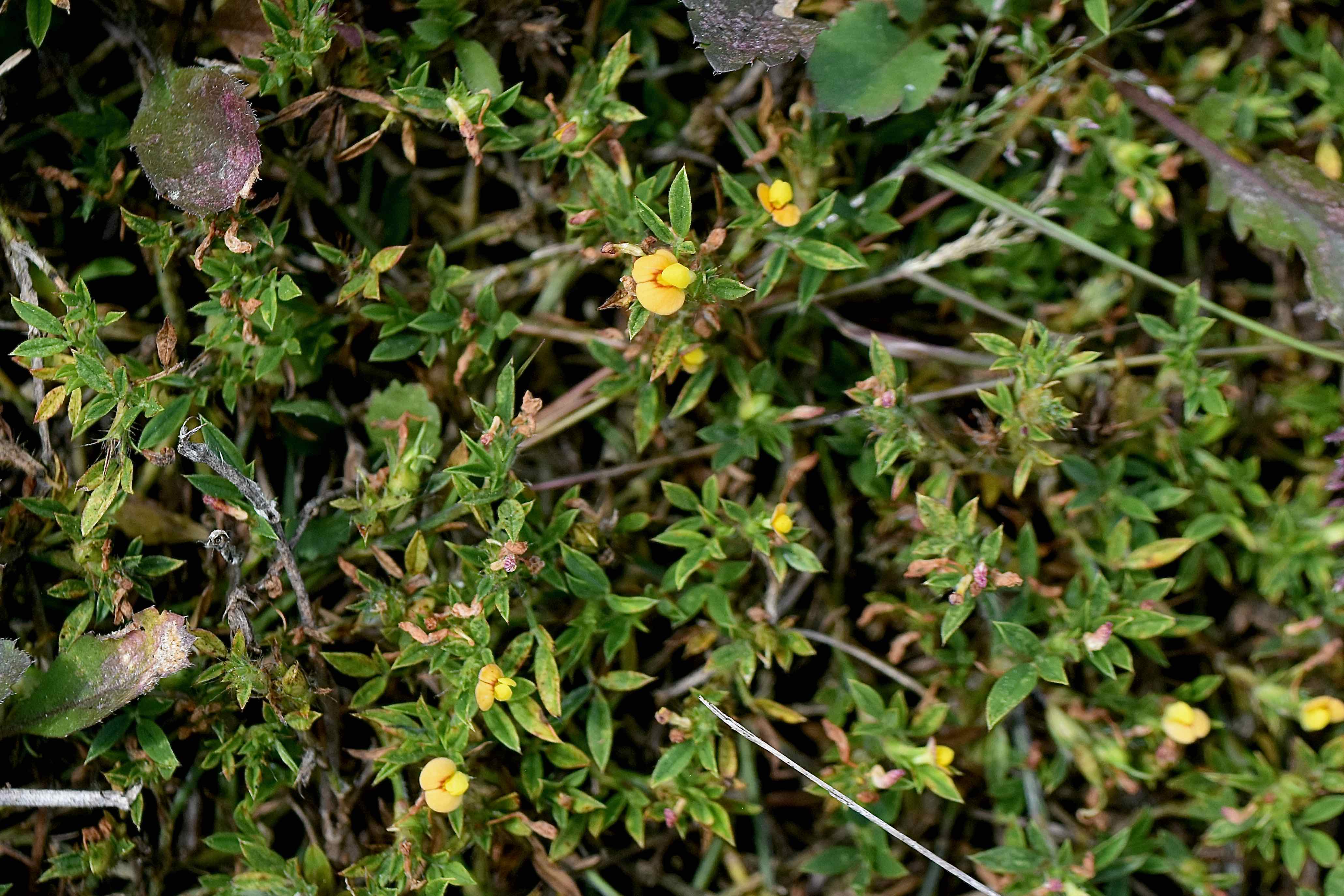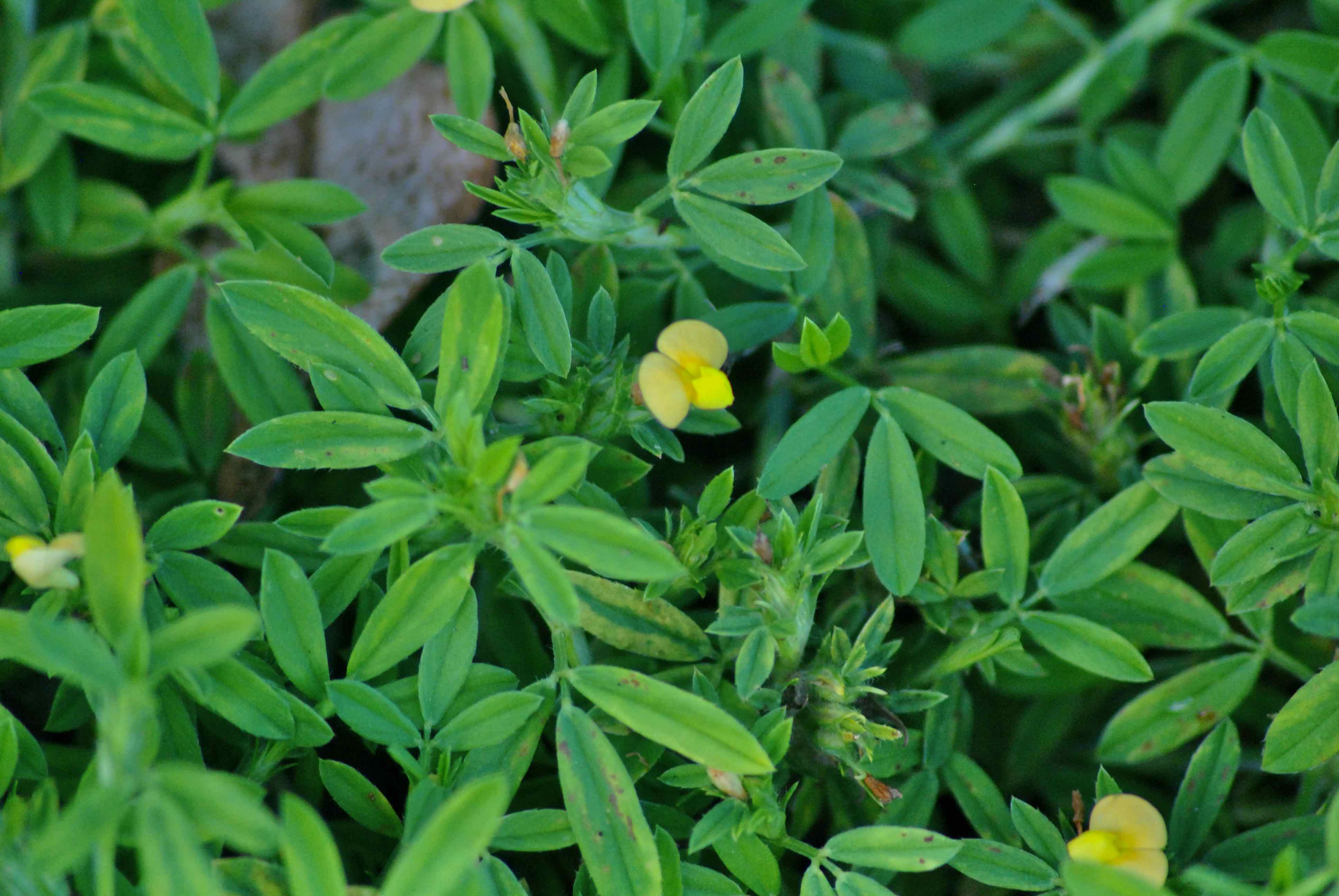 It has many branches and sprawls along the ground. If it does catch your attention, it’s because of its small, bright yellow pea-like flowers. The flowers have five petals, the lower two fused to form a keel, with a dash of red near the throat. It blooms year round.