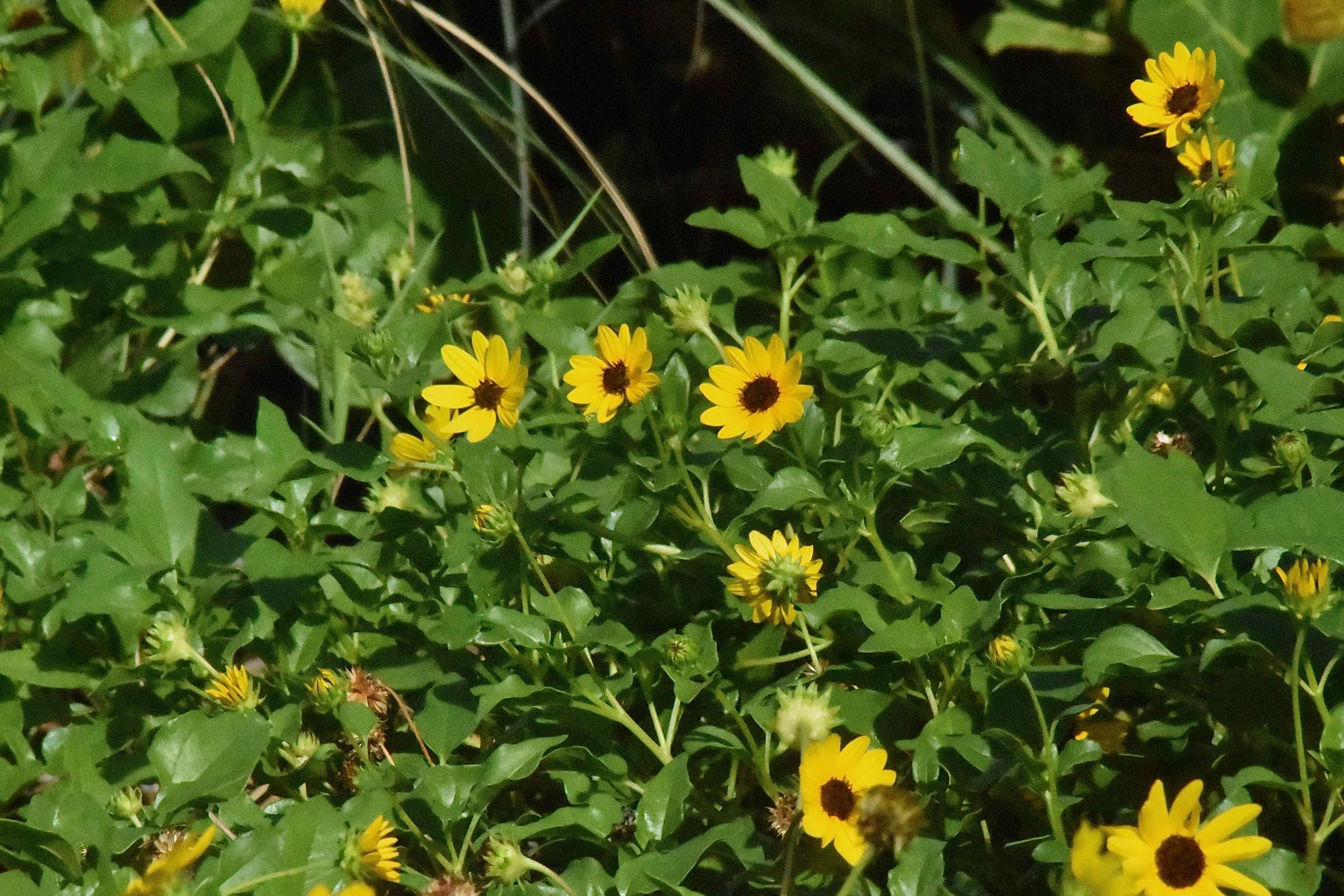 Now some east coast dune sunflower basics: First of all, it is related to the common sunflower, sharing the same genus, but the two plants aren't likely to be mistaken for the other. Both have golden-yellow flowers with a brown center, but where the sunflower is absolutely huge, the east coast is tiny by comparison. Its bloom is only a couple of inches across and at its tallest, stands only a foot or two off the ground (The Lady Bird Johnson Wildflower Center puts it in class as tall as six feet, but we've never seen more than two feet, if that. And it's an extremely common plant. It's more of a ground hugger.) East coast is a perennial, flowers year-round in South Florida, fall through spring being peak seasons. It spreads along the ground and forms large patches.