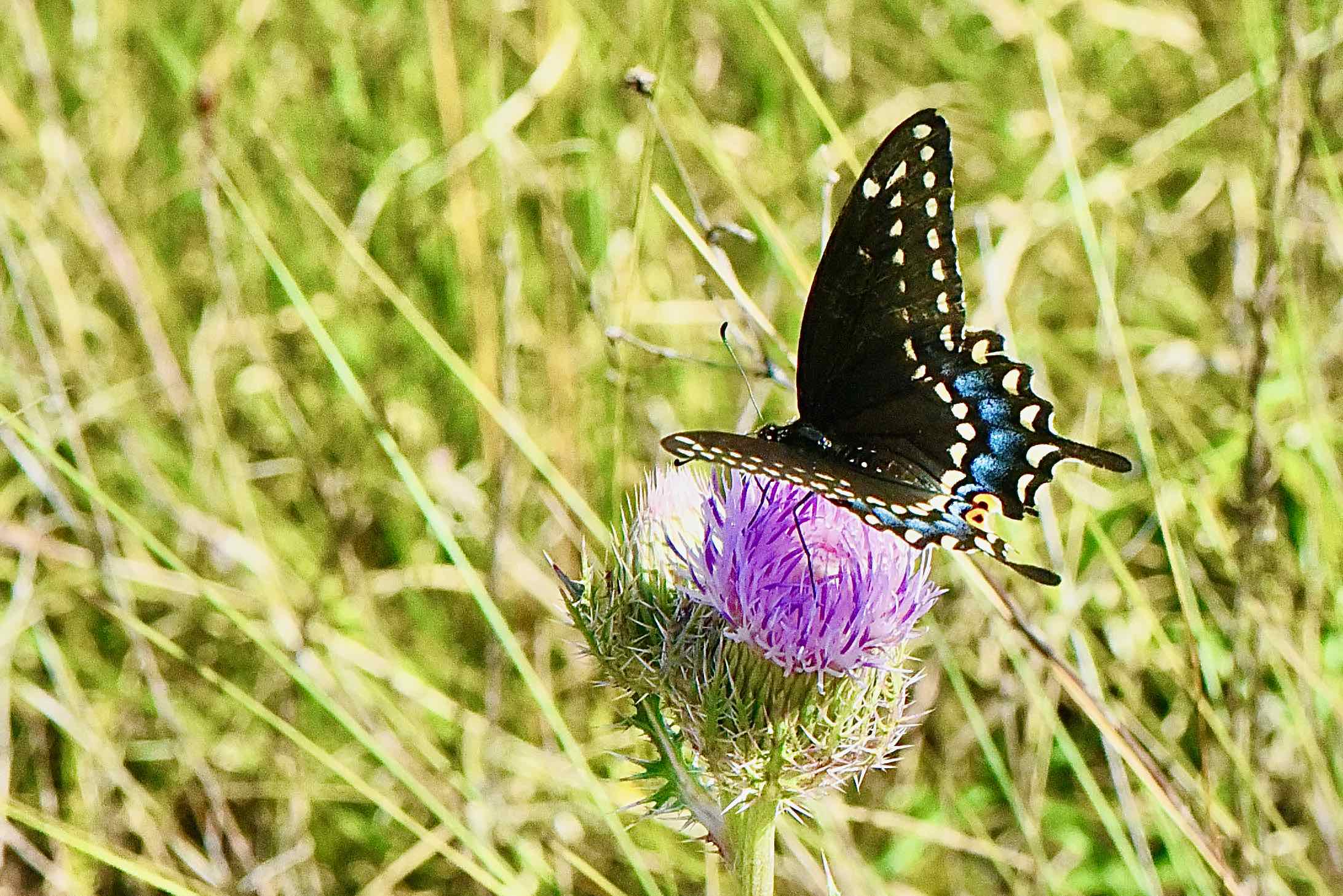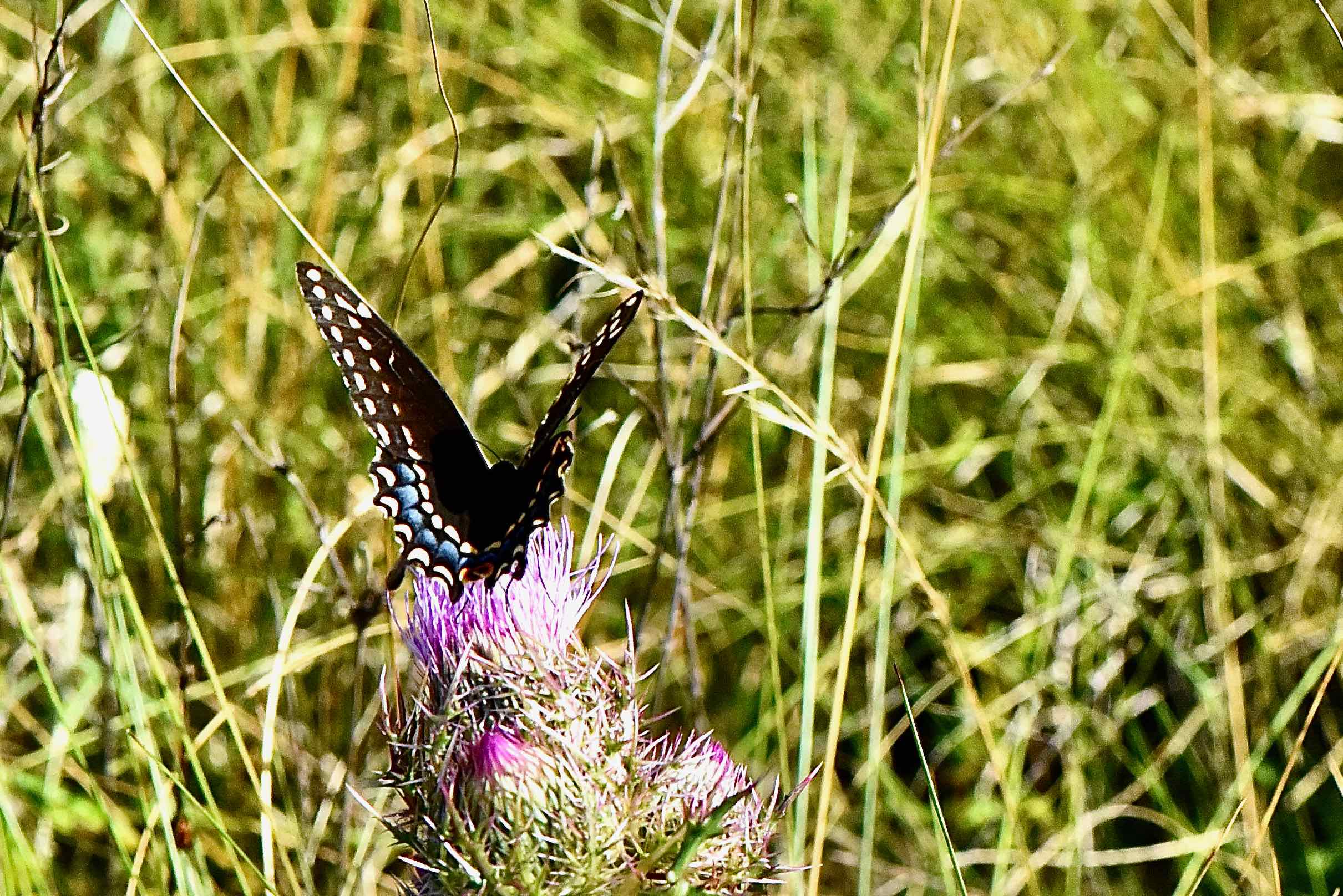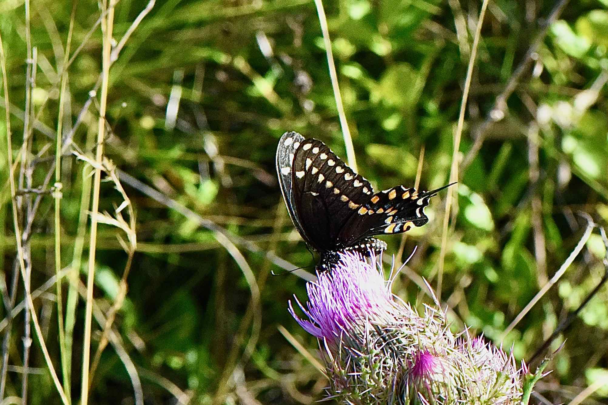 Nectar plants include milkweeds and thistles, as in the purple thistle that the eastern black swallowtail is feeding on in the photos shown on this page.