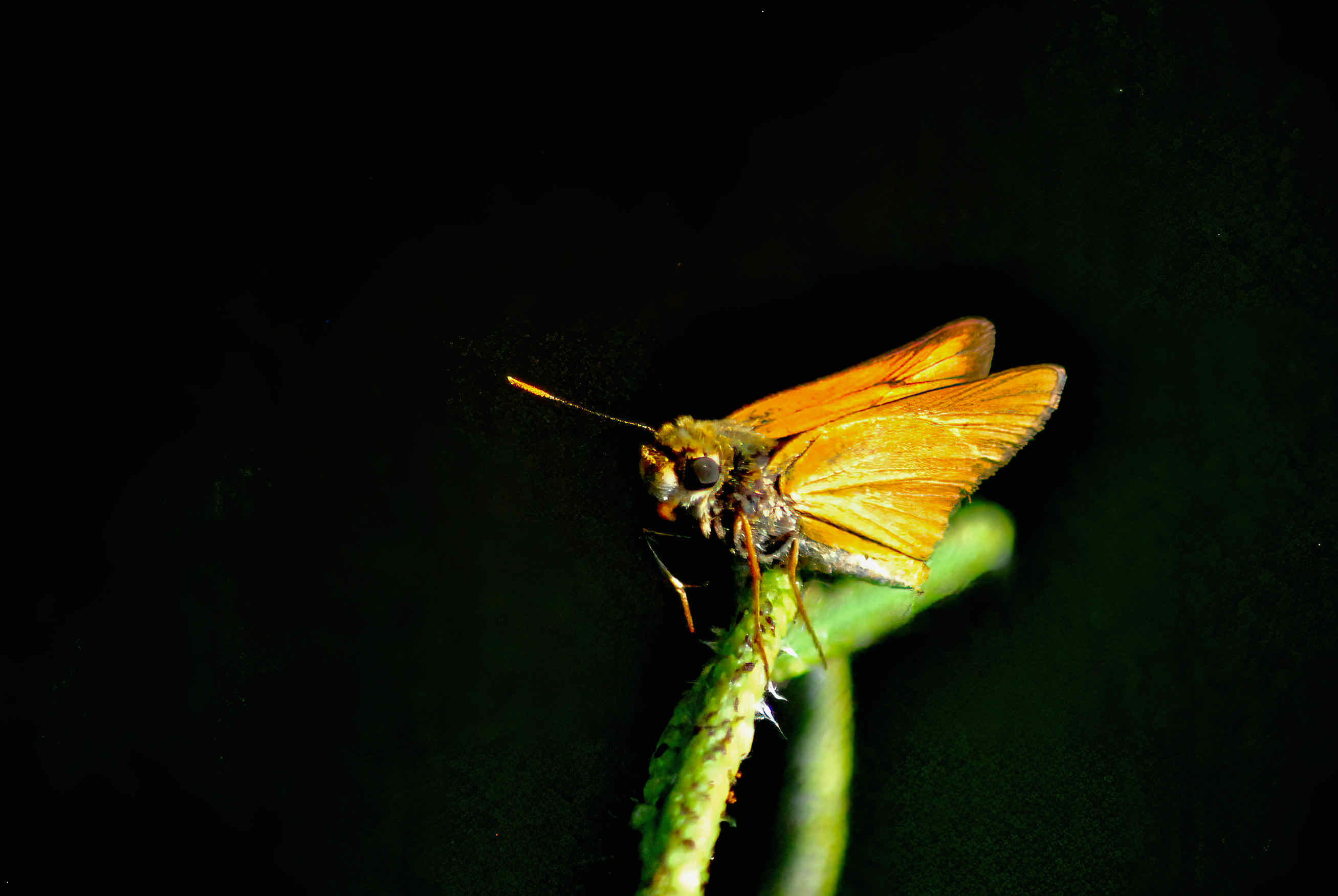 If you find a brownish-orange butterfly fluttering low, just above your lawn, there's a pretty good chance it's this guy, the fiery skipper, Hylephila phyleus. It likes grass. In fact, it depends on grass. Bermuda, St. Augustine and crab grasses are host plants for the fiery skipper's offspring.
