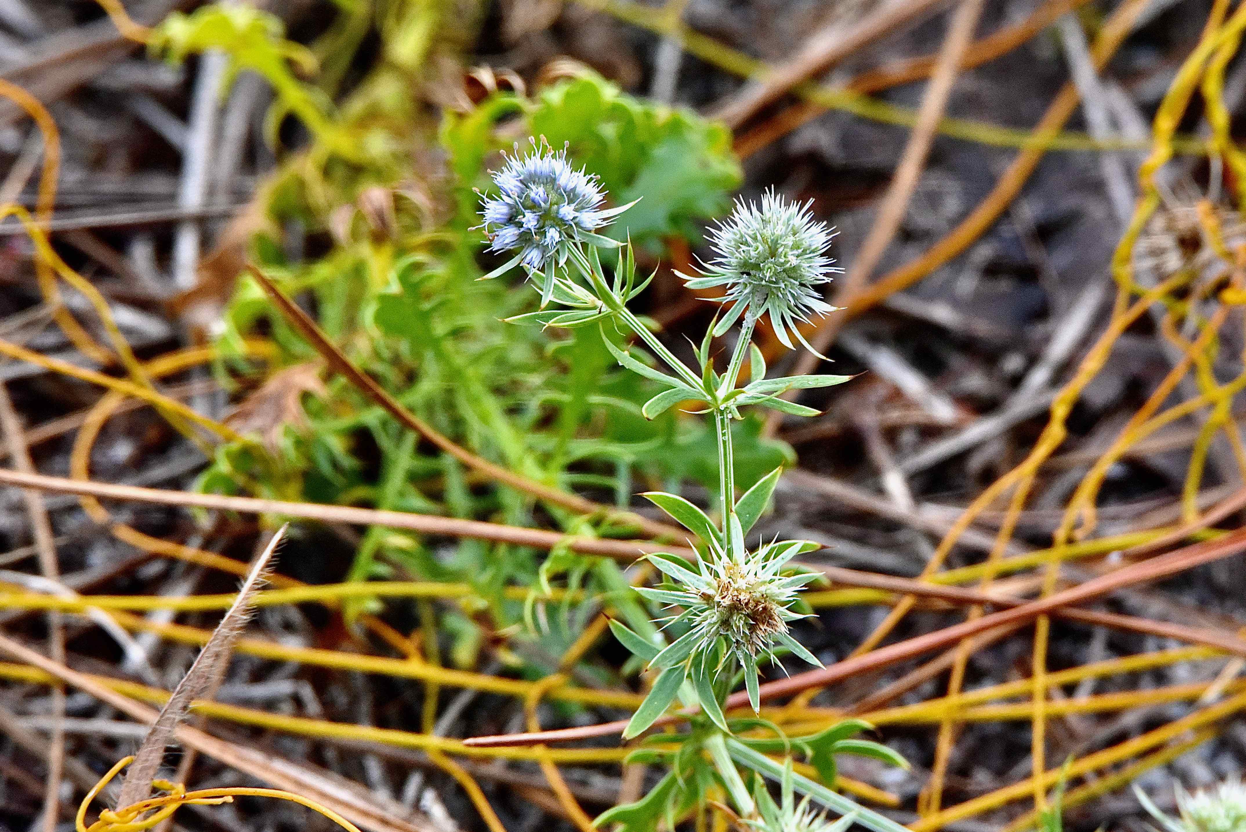 Some sources we’ve seen say fragrant eryngo can grow to a foot or two off the ground; most say the upward limit is more like six inches. The plants we’ve seen were sprawling rather than upright, with stems a foot or so in length. Fragrant eryngo can form small patches.