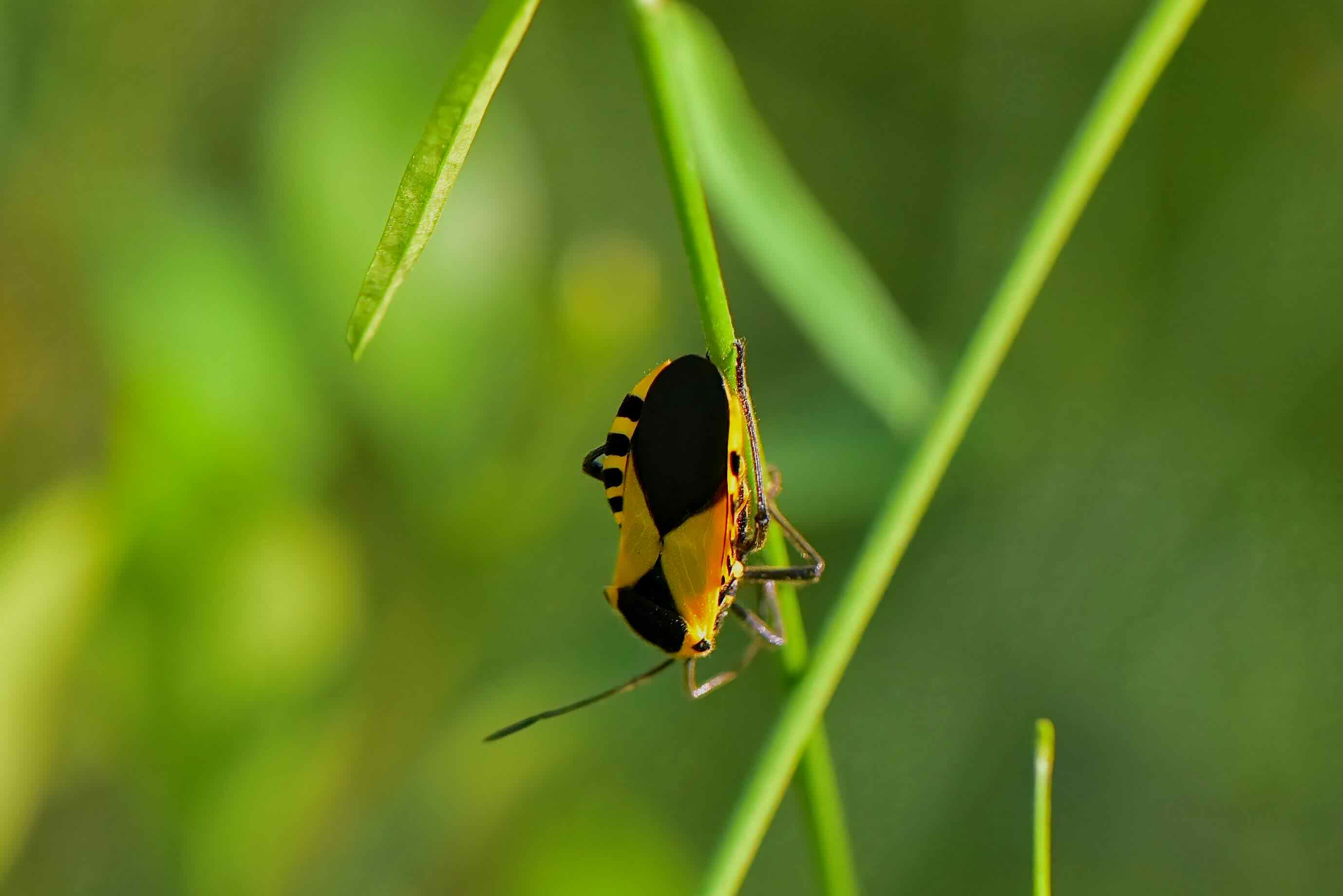 Giant milkweed bugs are not really giants, going only about two-thirds of an inch in length, but they are about a third larger than large milkweed bugs. They’re a bright yellow-orange with black markings above and below, also similar to large milkweed bugs as we noted above. The markings are sufficiently different that it isn’t difficult to tell the two apart sans measuring stick.
