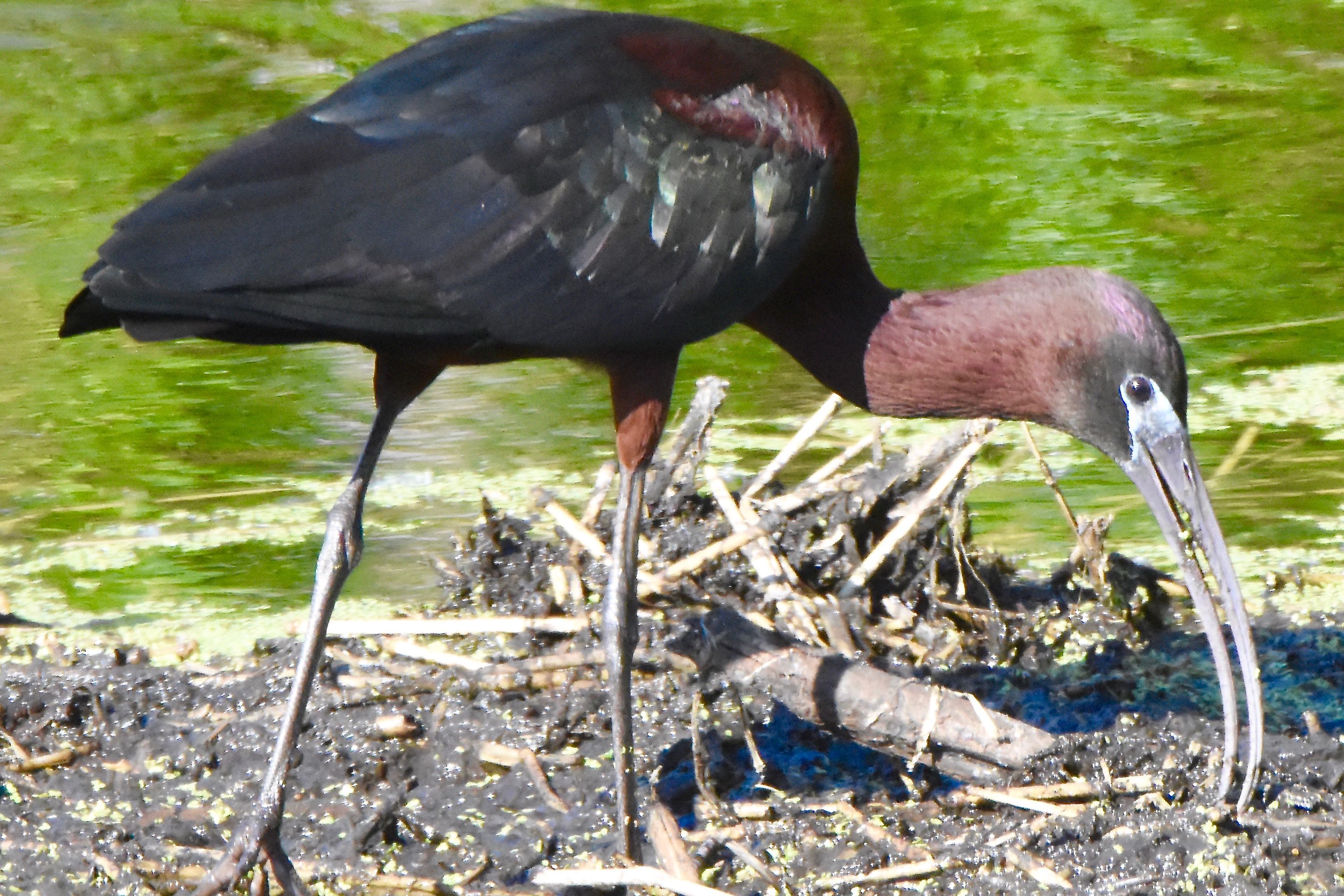 It's similar to the white Ibis in size, shape, habitat and in the way it forages. Both birds can be found patrolling South Florida's marshes, often together. They are members of the same family, Threskiornithidae (ibises and spoonbills), but not the same genus. The closest relative to the glossy is the white-faced ibis, which is nearly identical aside from some different coloration in the face and on the legs. The white-faced is more of a western bird and doesn't make its way to Florida.