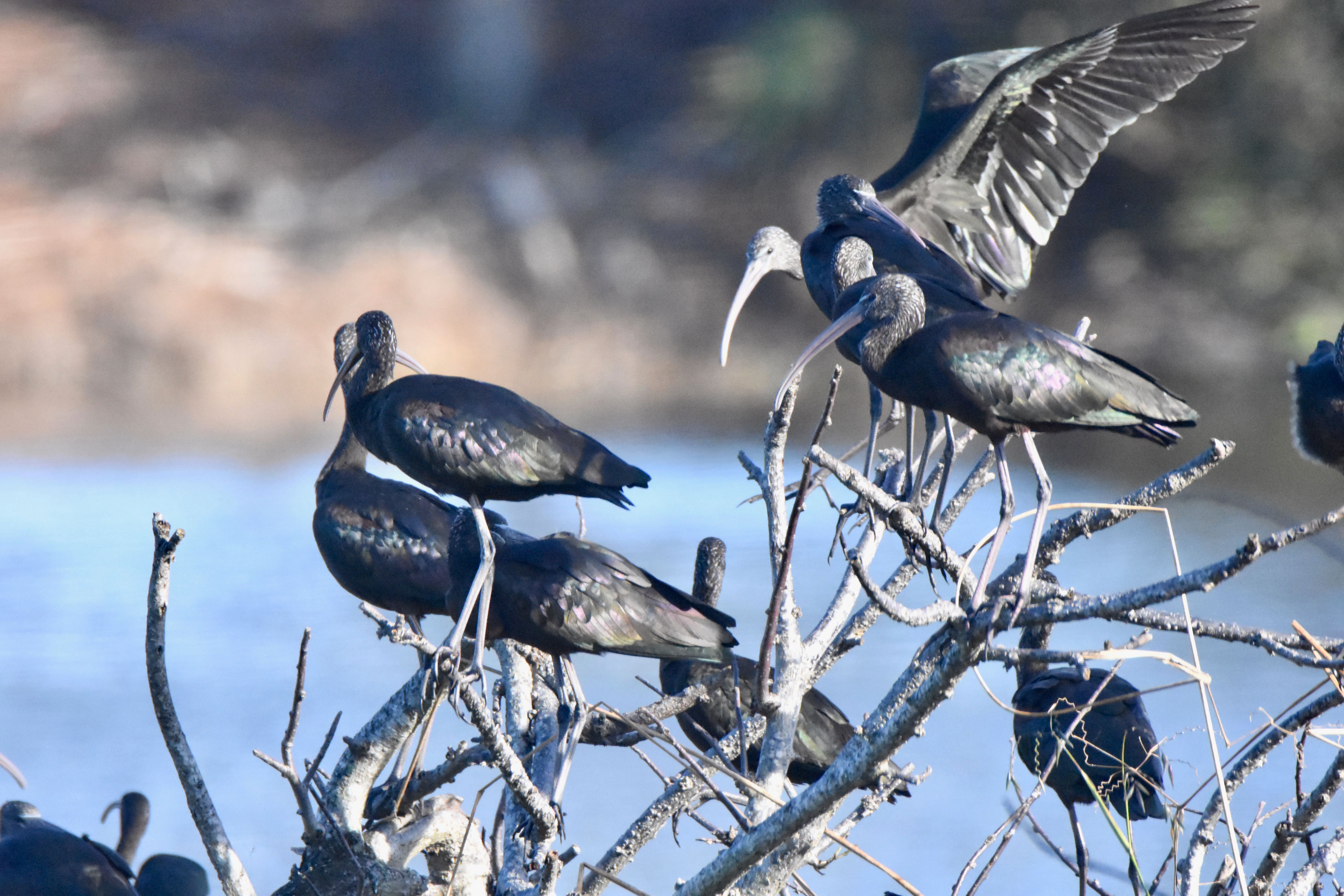 Glossies are iridescent reds that flash blues and greens in the right light. They have a white face mask around the eyes and a long, curved bill. They can exceed two feet in body length.