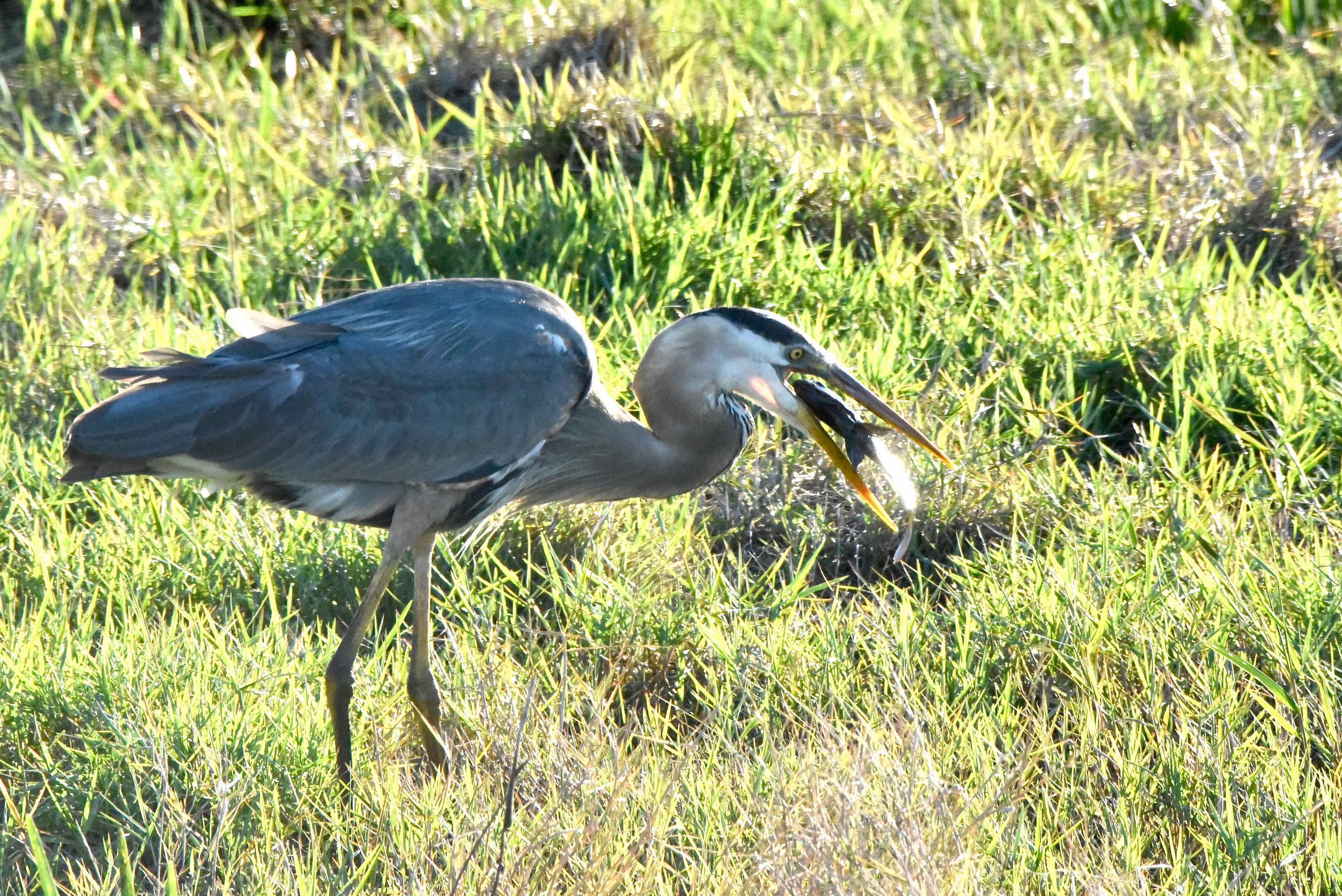 Great blues are mostly bluish-gray, with a white head and a dark blue patch that goes around the head from one eye to the other, creating sort of a male pattern baldness look. They also have dark blue patches on their shoulders.