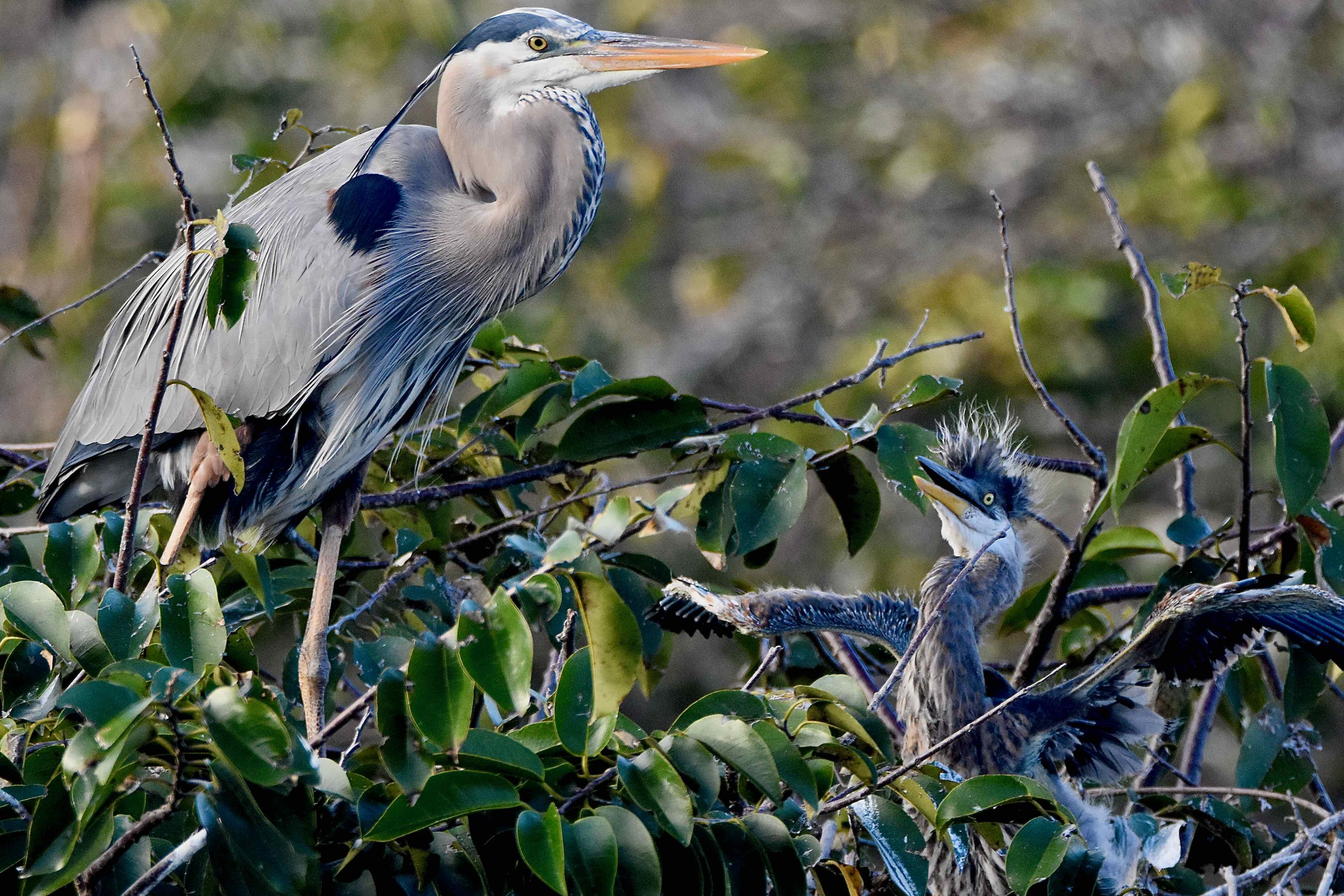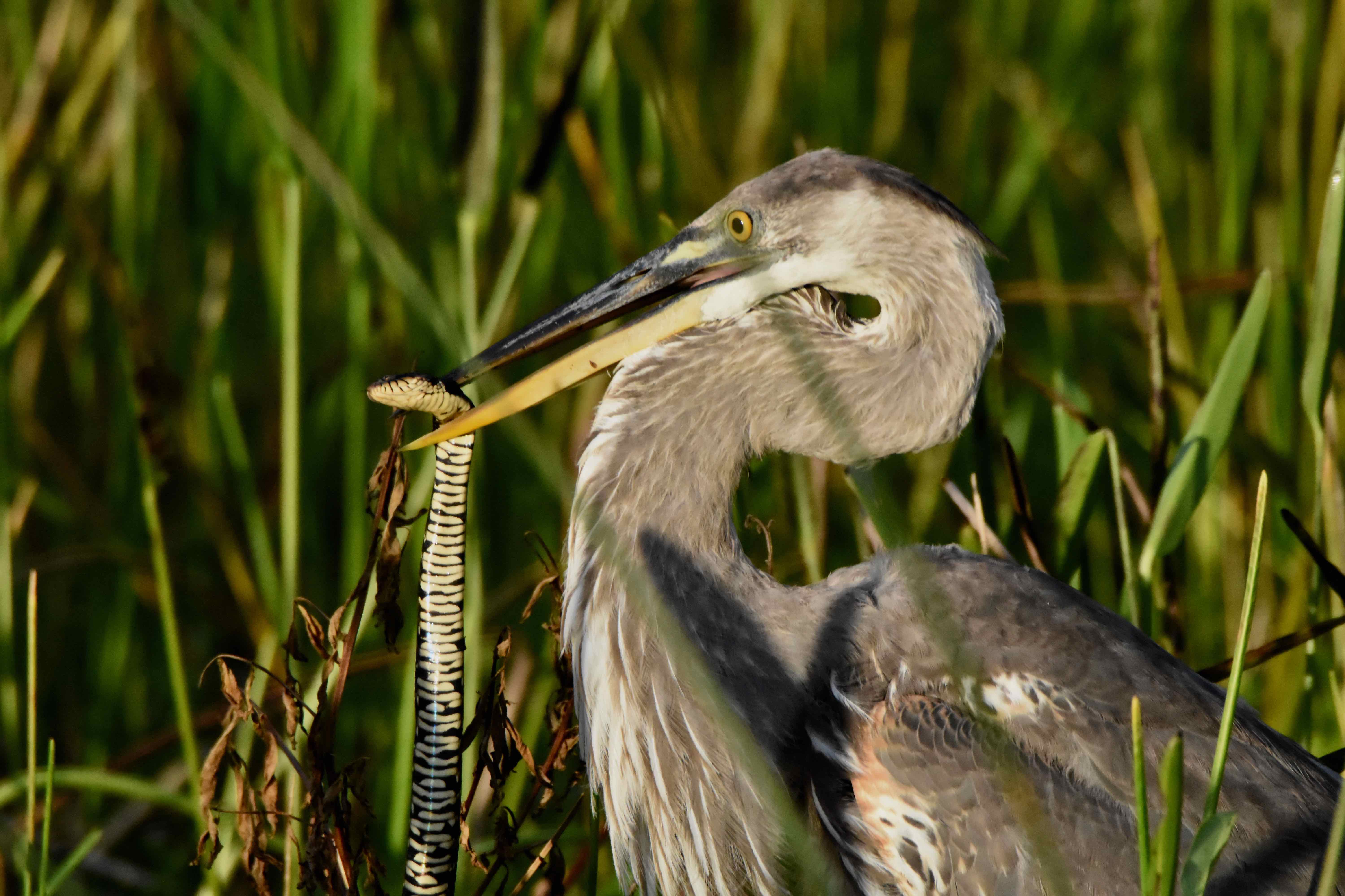 Great blues will eat just about anything that moves — fish, small mammals and reptiles, including snakes, and other birds. Even smaller alligators fear this heron (adult gators, however, see them as tasty treats). They will forage through the shallows or stand perfectly still, neck coiled, waiting to grab or spear a meal with their long, sharp bill.