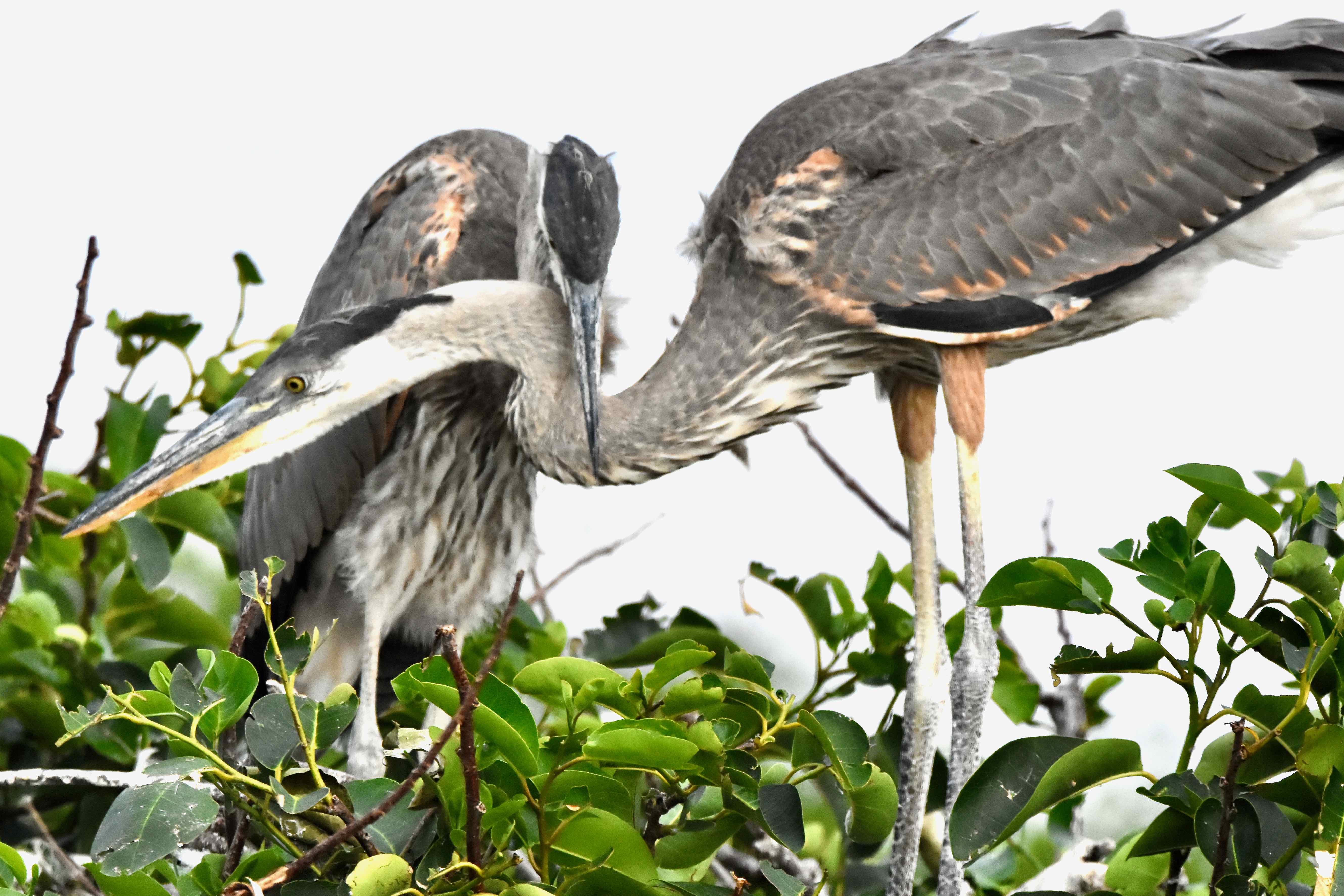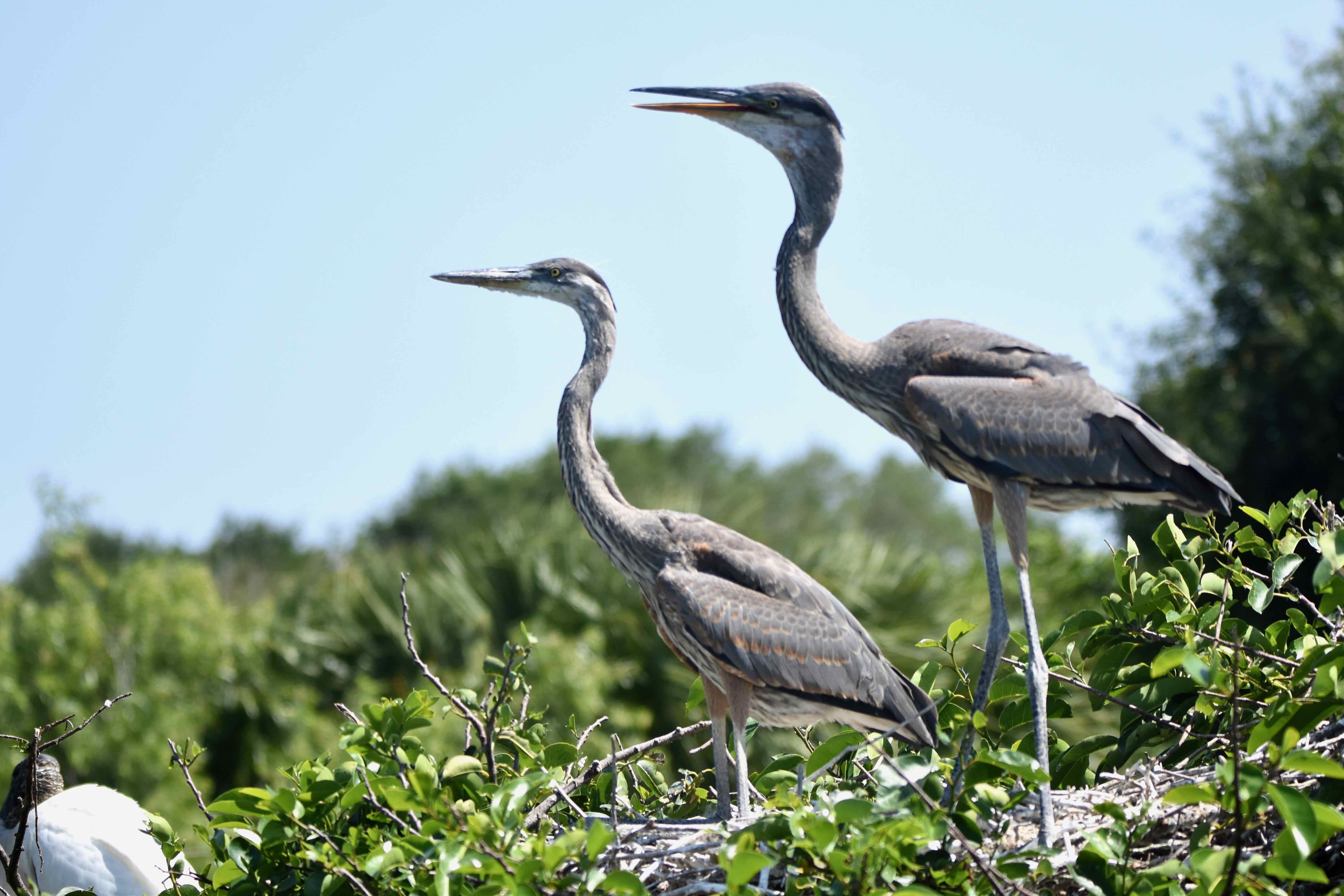 Both male and female great blues take part in nest building. Males gather sticks and presents them to their mates, who weave them together. Females will soften the interior by lining it with moss, grasses and leaves. The process can last a couple of days or a couple of weeks. Great blues are known to reuse a nest. The site itself can be in trees — the nests on this page are in pond apples — or on the ground. Great blues nest in colonies with other wading birds.