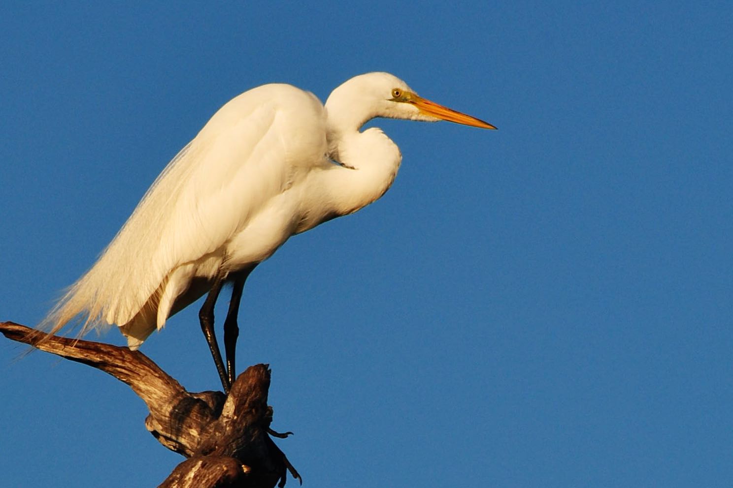 In breeding season, a portion of the great egret’s face turns a neon green, as seen in the photo above. It also displays long, filament-like plumes called aigrettes, which were almost the ruin of this bird. In the late 19th and early 20th centuries these plumes were used to adorn ladies’ hats; demand was such that 95 percent of the great egret population was wiped out. Outrage over the slaughter provided the impetus for the passage of the first federal laws protecting the egret and other birds. The great egret became the symbol of the National Audubon Society.