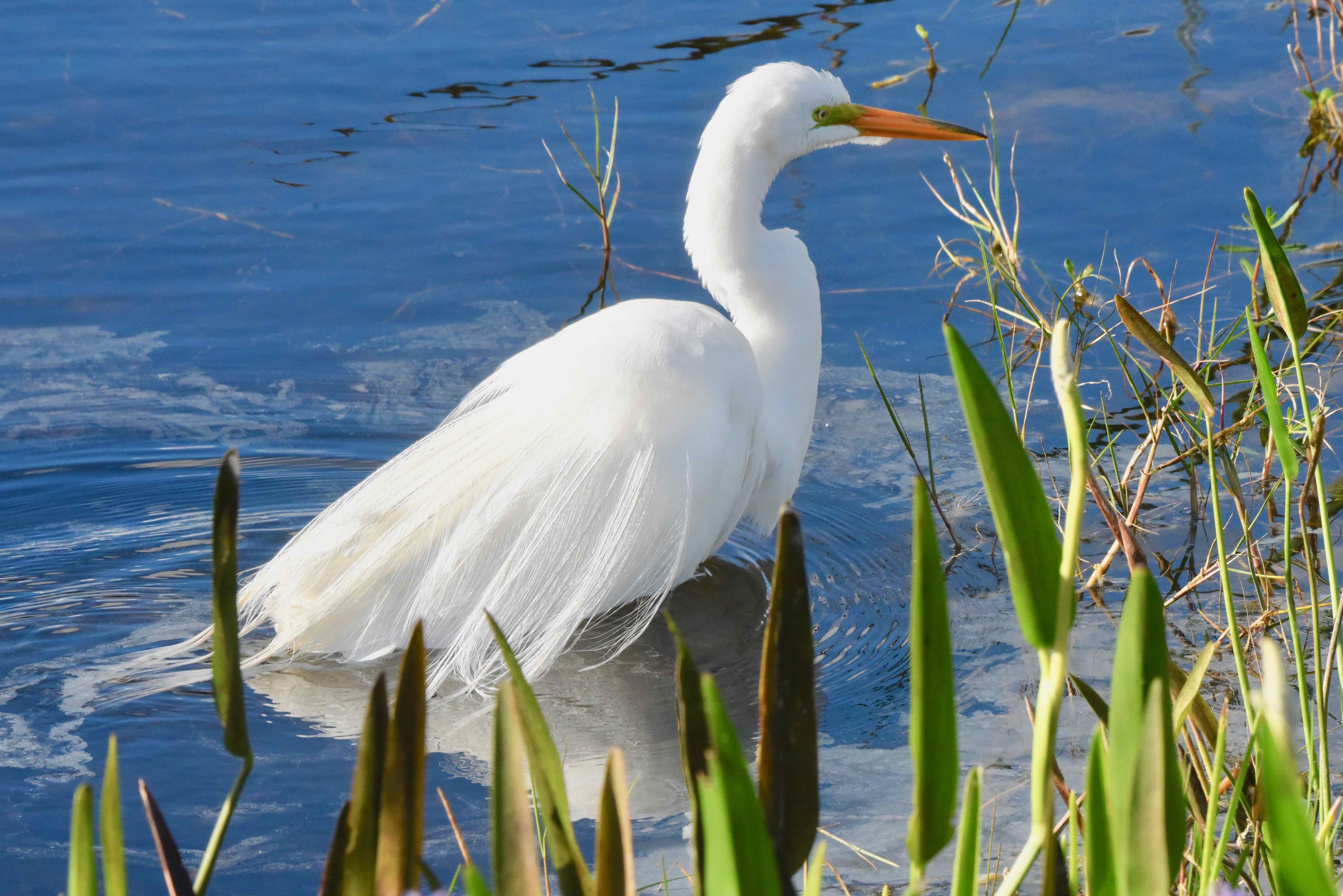 The great egret, Ardea alba, is a “can’t miss” bird because of its large size and pure white feathers. It’s a common sight year-round in South Florida’s wetlands.