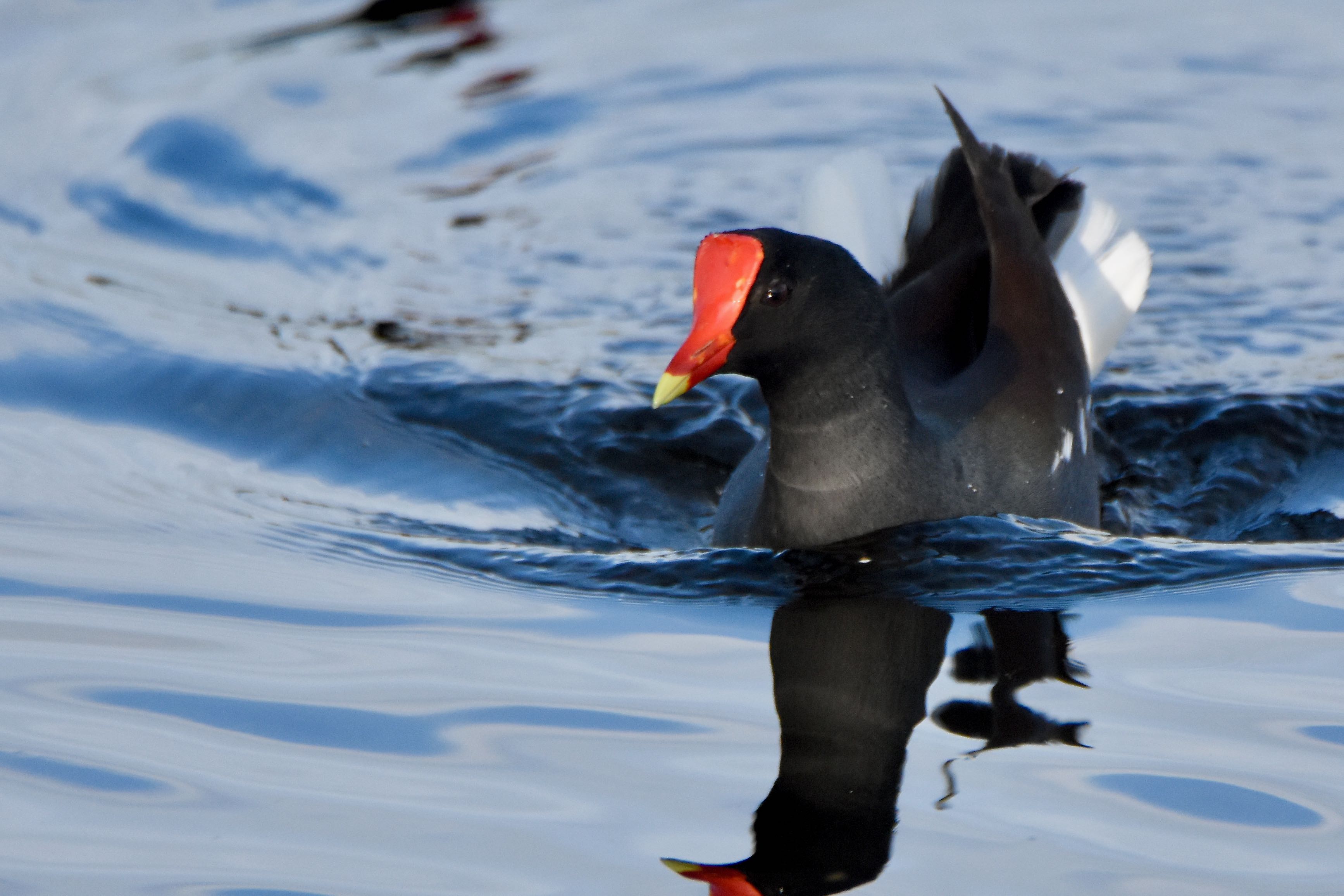 Moorhens are in the same family as purple gallinules. They share the same habitat, are about the same size and shape, though the coloring of each species is quite different, the purple gallinule being almost gaudy in the right light, the moorhen relatively plain. So somewhere along the line, our bird, the moorhen, came to be known as the common gallinule. Both Audubon and the Cornell Laboratory of Ornithology still use that name. However, a Florida Fish and Wildlife Conservation Commission report done way back in 2003 says common gallinule already was outdated, ditched in favor of common moorhen. In 2018, the American Ornithological Society, the arbiter of bird common names in this part of the world, suggested that common gallinule was too confusing and proposed a new name: the American moorhen. Again, we'll stick with just plain moorhen.