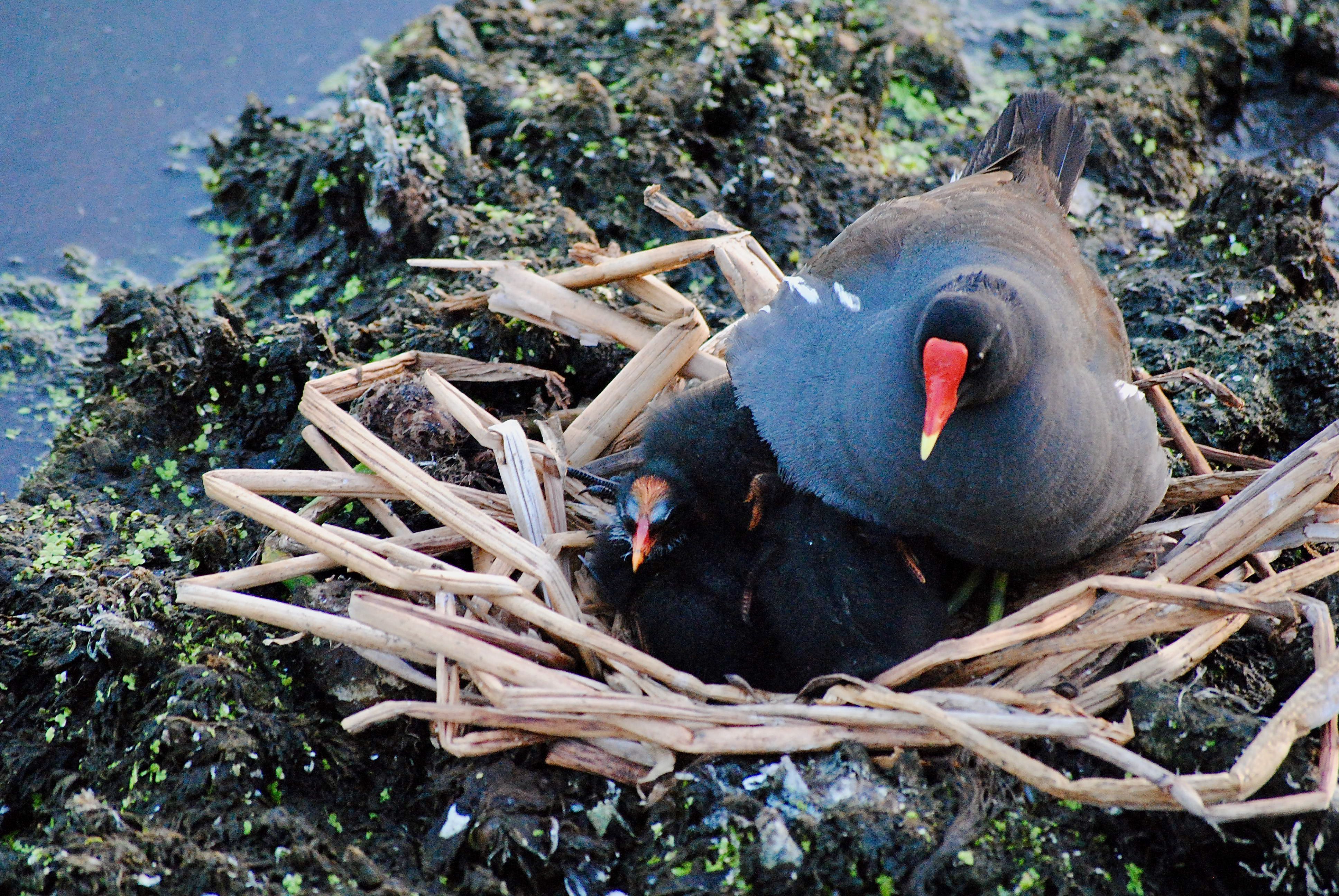 Moorhens in Florida breed year-round, though what we've seen is mainly late winter into summer. Females will lay as many as 15 eggs in a nest made of grasses, sedges and other vegetation on mounds slightly above water levels. Most of the broods we've seen are considerably smaller, more on the order of two to five. The FWC said nests with as many 21 eggs have been seen, though they're likely the result of nest dumping — females literally dumping their eggs in another's nest.