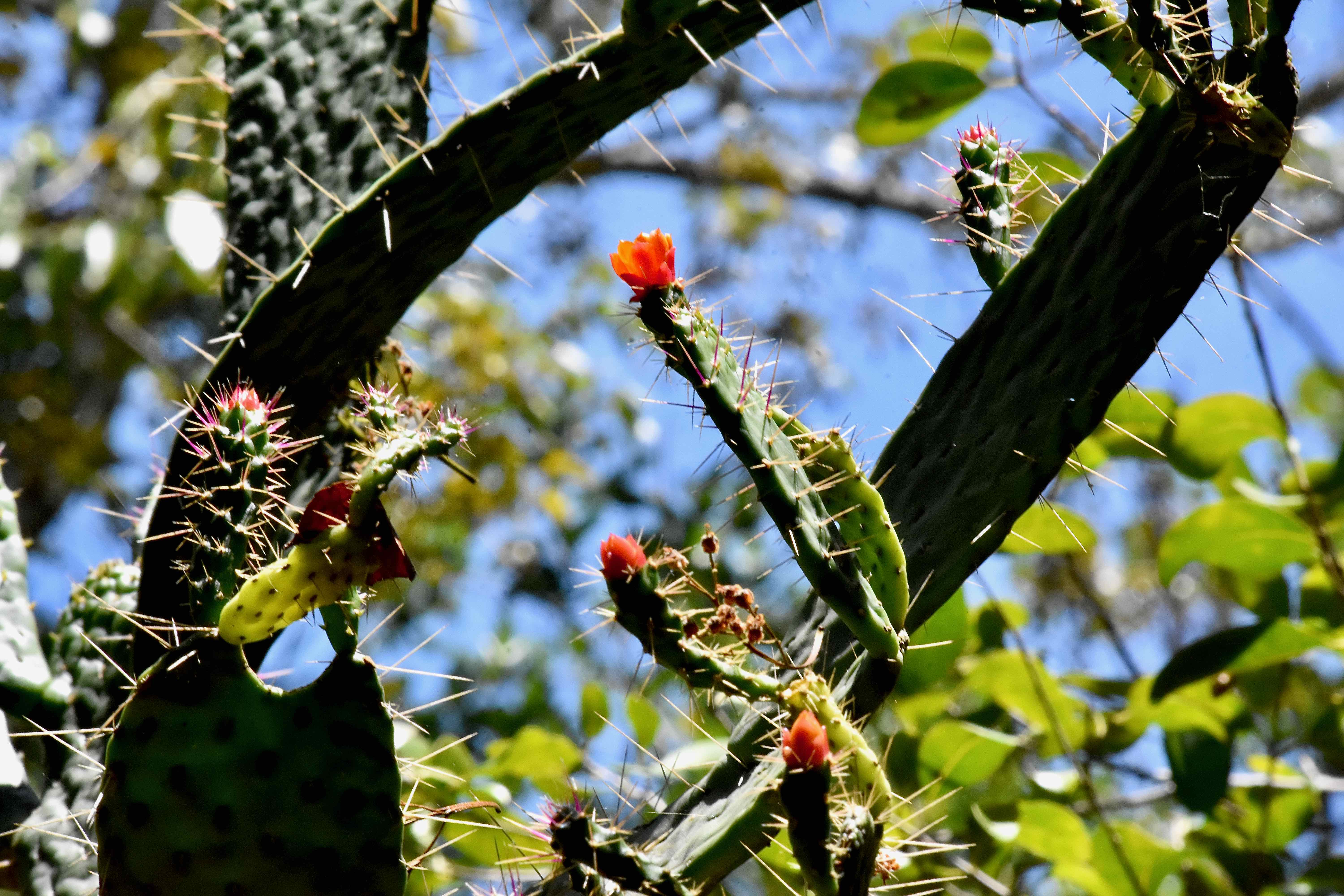 It is a Florida native cactus, large, almost tree like, growing as tall as 15 feet. It has a cylindrical trunk that's gray and extremely spiny. You can get a good look at it in the photo above. The branches are held out at angles, resembling a signaling system called semaphore that uses flags and arms held in various positions to communicate messages. The branches aren't segmented the way prickly pears are. The spines are as long as four inches and occur in clusters of two to four. Flowers are about an inch across, red to orange in color and bloom throughout the year, though peaking in December through April. The fruit is one to three inches long, yellow, flat and spiny. It is a member of Cactaceae, the cactus family.