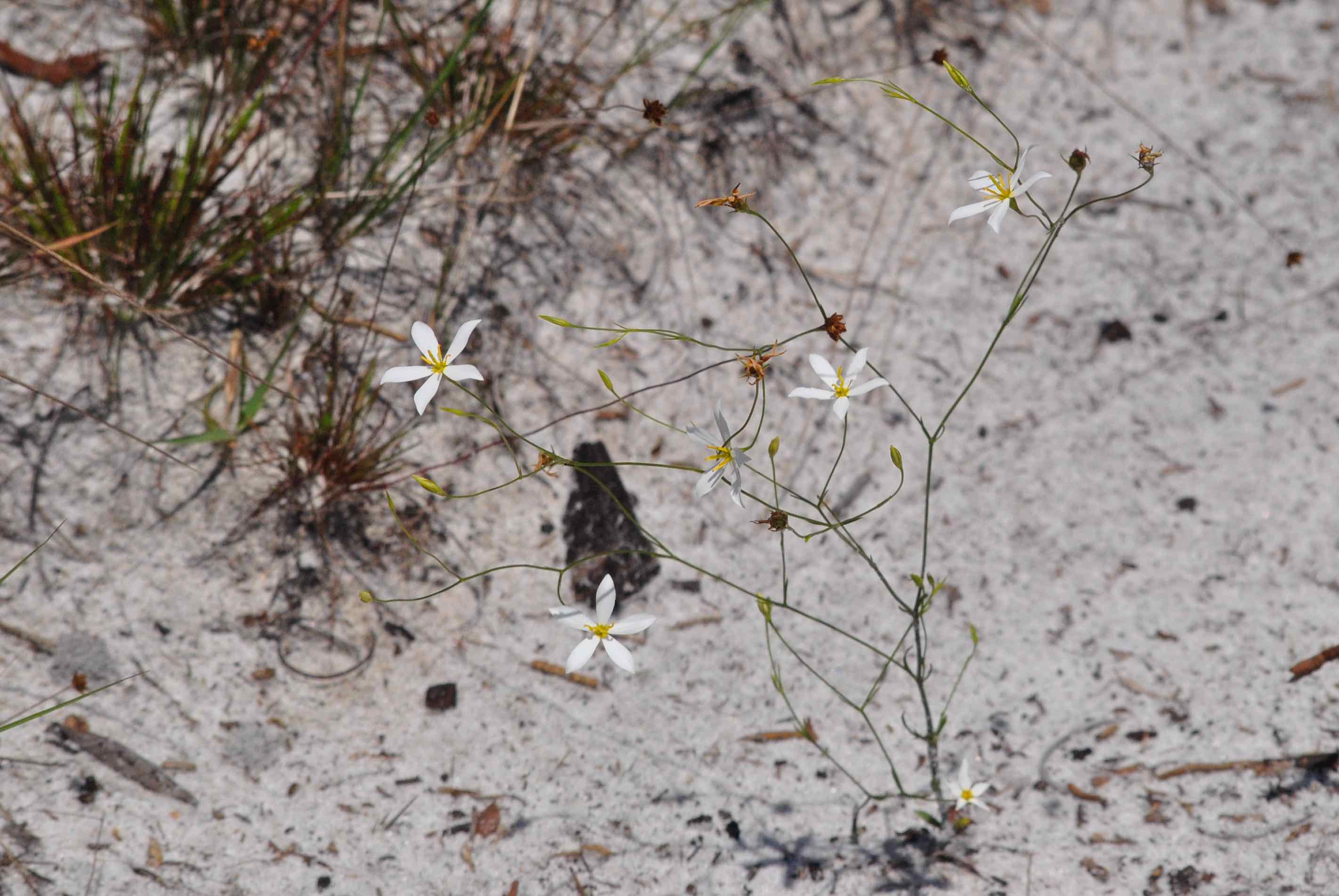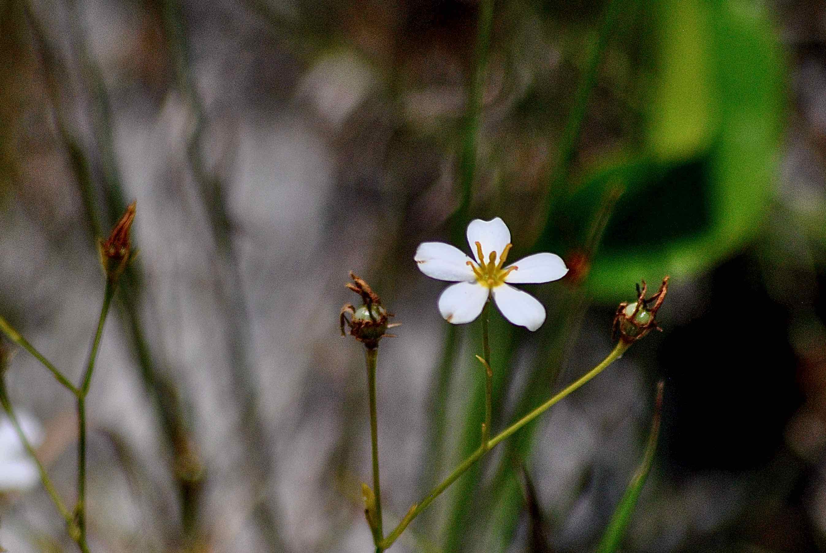 Shortleaf rosegentian is an annual or short-lived perennial. The flowers have five white petals, each of which come to a point. There are five bright yellow stamen surrounding a greenish-yellow pistil, the female part of the flower. It blooms mainly spring into the fall, but it can bloom in winter as well if the weather is warm enough. We have seen it in bloom as early as January during our visit to Atlantic Ridge in 2024.