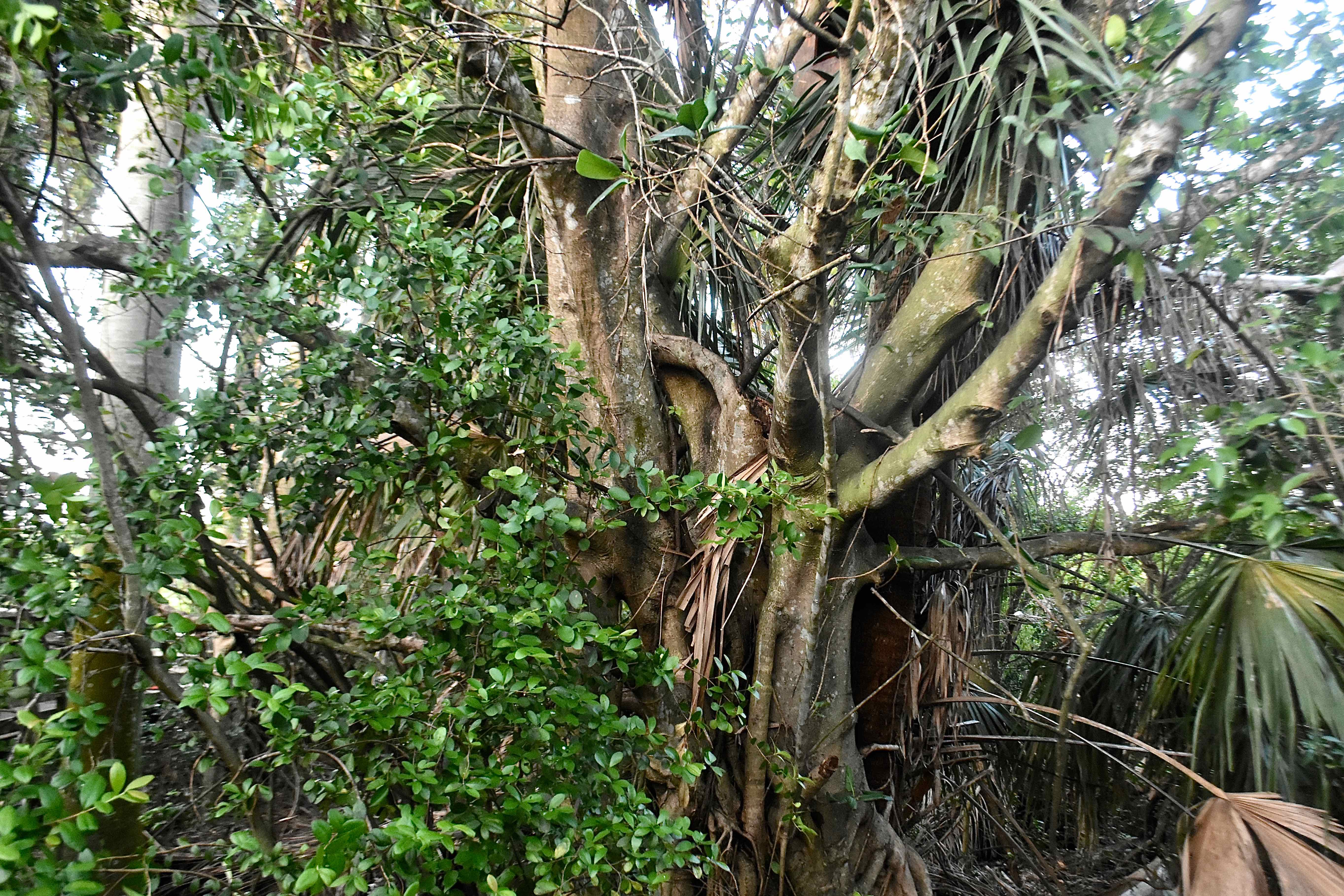 It usually starts out life as an epiphyte — an air plant, relying on a host, usually a cabbage palm for structure only. A seed drops in a boot of a cabbage palm, germinates and the seedling starts sending down aerial roots to the ground. When they reach the ground, they'll start providing structure for the young tree, and it will start competing with the host for water and nutrients.