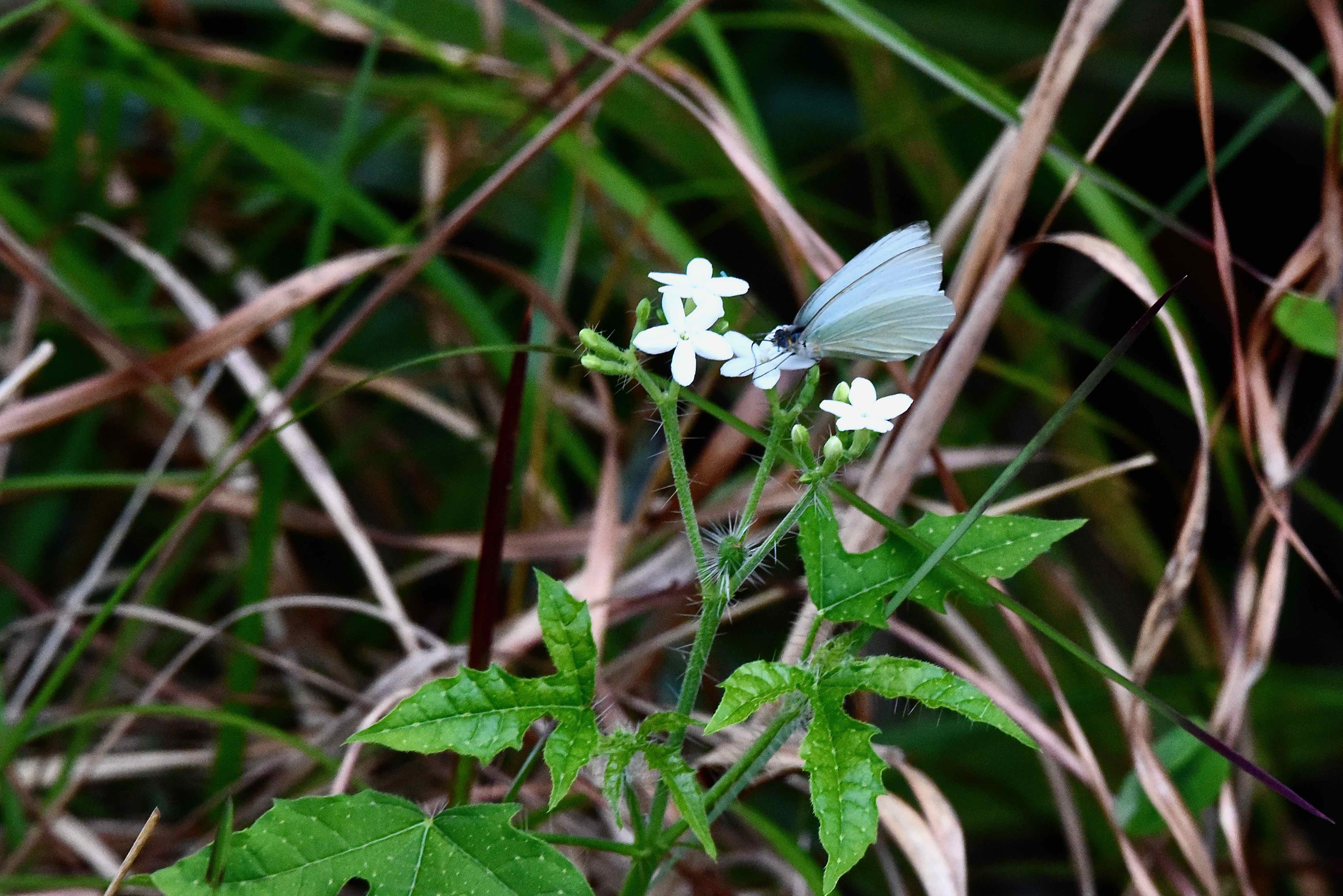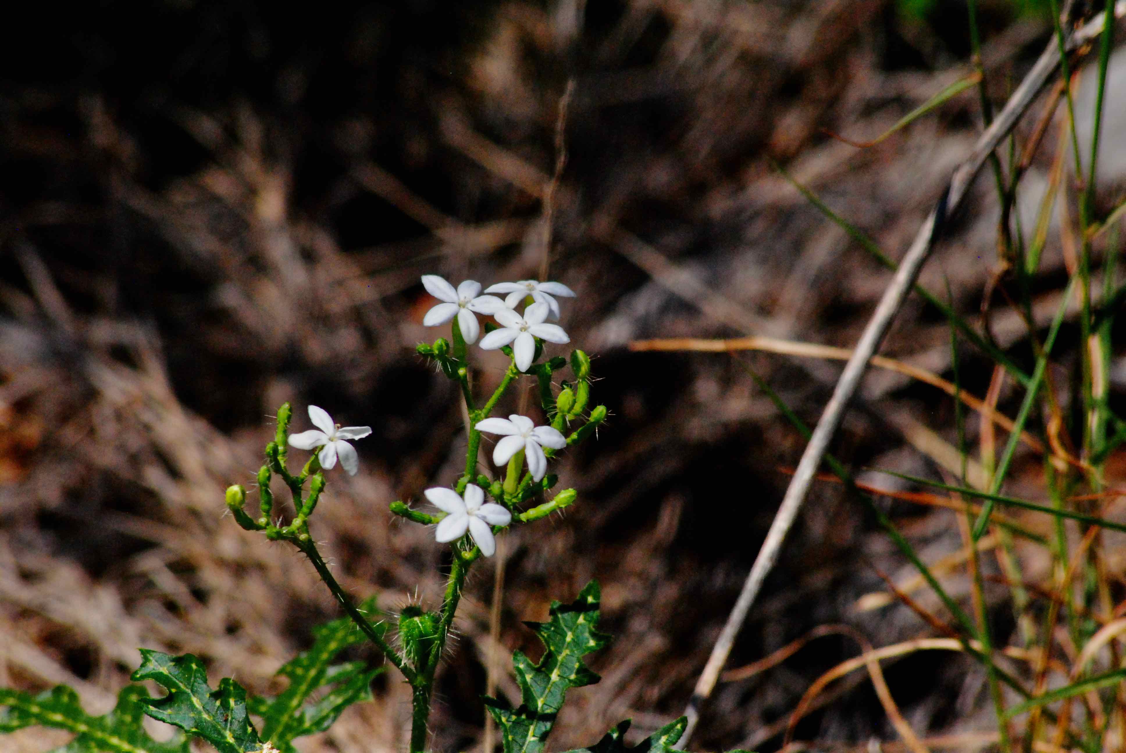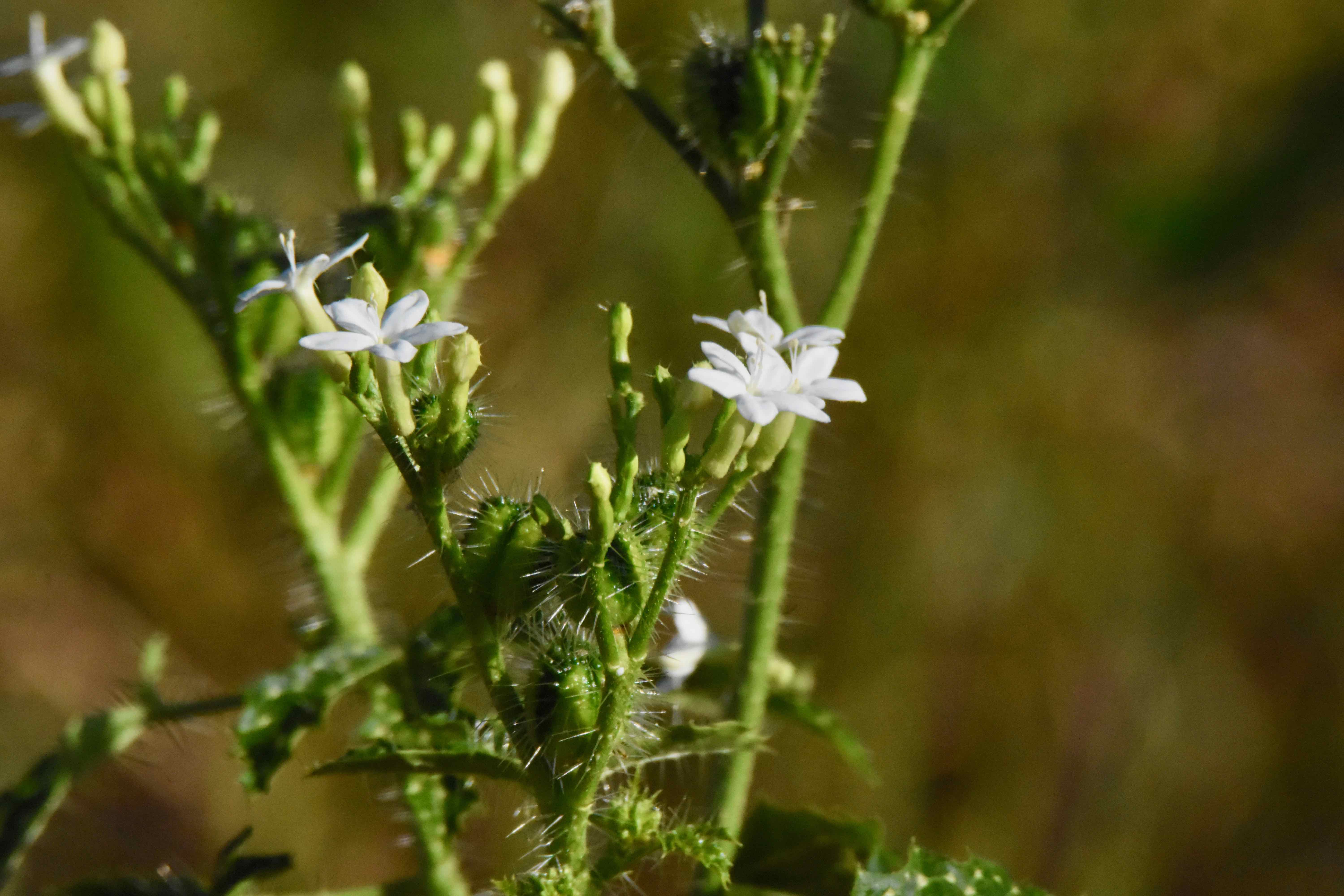 The plant can grow as tall as three feet but has a soft, herbaceous stem. The leaves are simple, deeply lobed and arranged alternately on the stem. To our eyes, It vaguely resembles an oak leaf. The edges, or margins, of the leaves have a few irregular blunt teeth. The leaves also have white veins and spots that help distinguish it. And yes, they have the same nasty hairs as the stalks. The only part of the plant that doesn't have them is the flower. It is a perennial plant that blooms all year in South Florida, peaking in the summer. Farther north, it flowers spring through fall. The flowers are bright white, trumpet-shaped, less than an inch acrosss and produce pods, each with three seeds that small birds eat. And yes, the pods are covered with the stinging hairs, which seem to do little to our feathered friends.