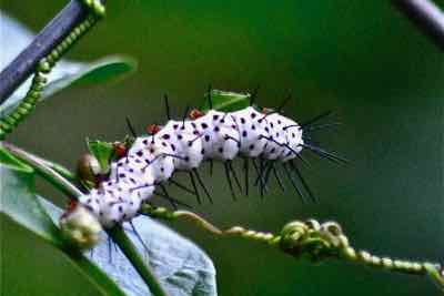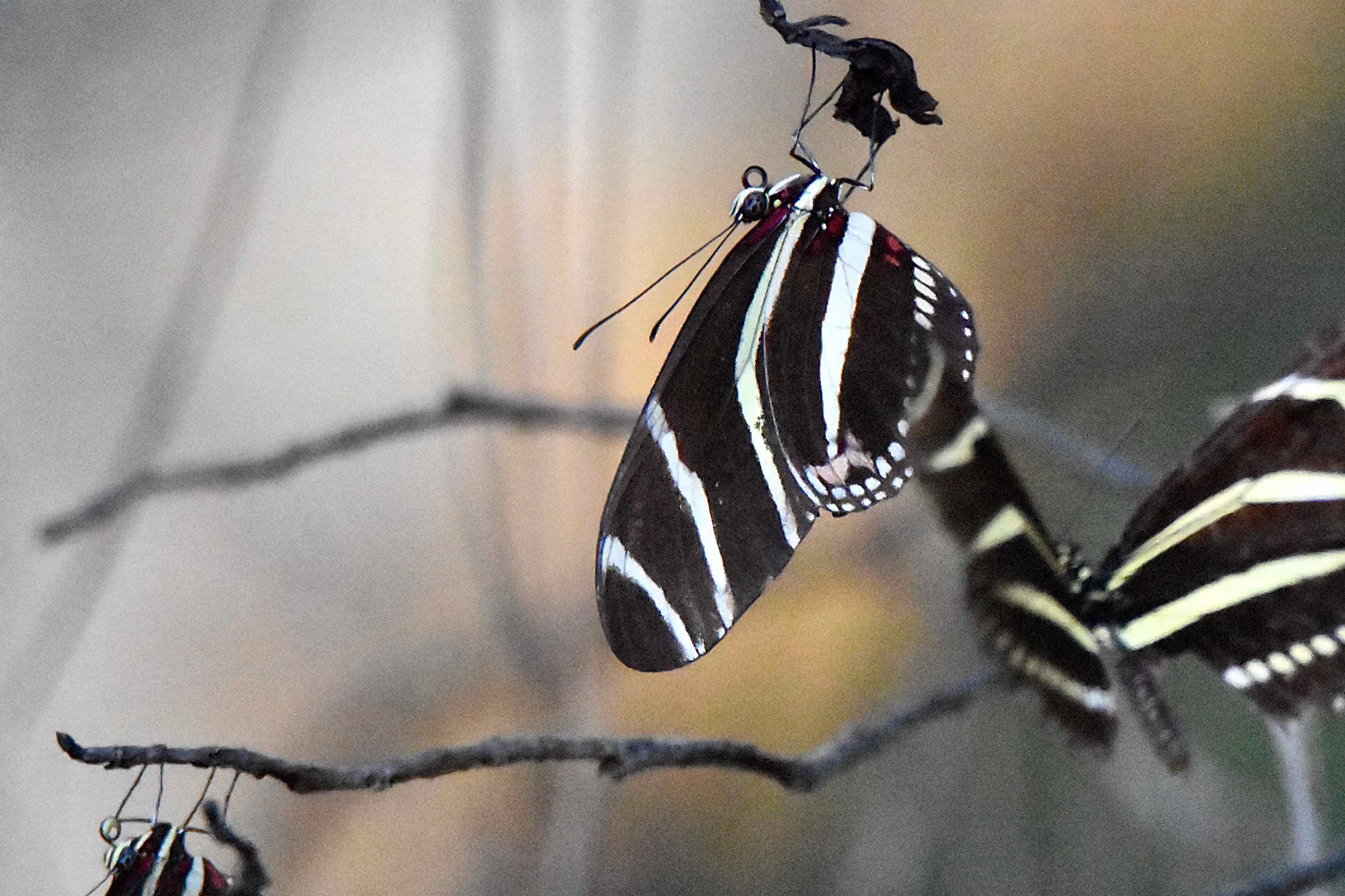 Zebras are on the medium side, with a wingspan between 2.75 and four inches. Males spend their day patrolling for females — and female chrysalids — the stage before full adulthood. They'll wait for the female to emerge, fertilize her and leave a chemical that will discourage other males from mating with her. Females will lay single or small clusters of eggs on new growth of various passion vines, including native corkystem and purple.
