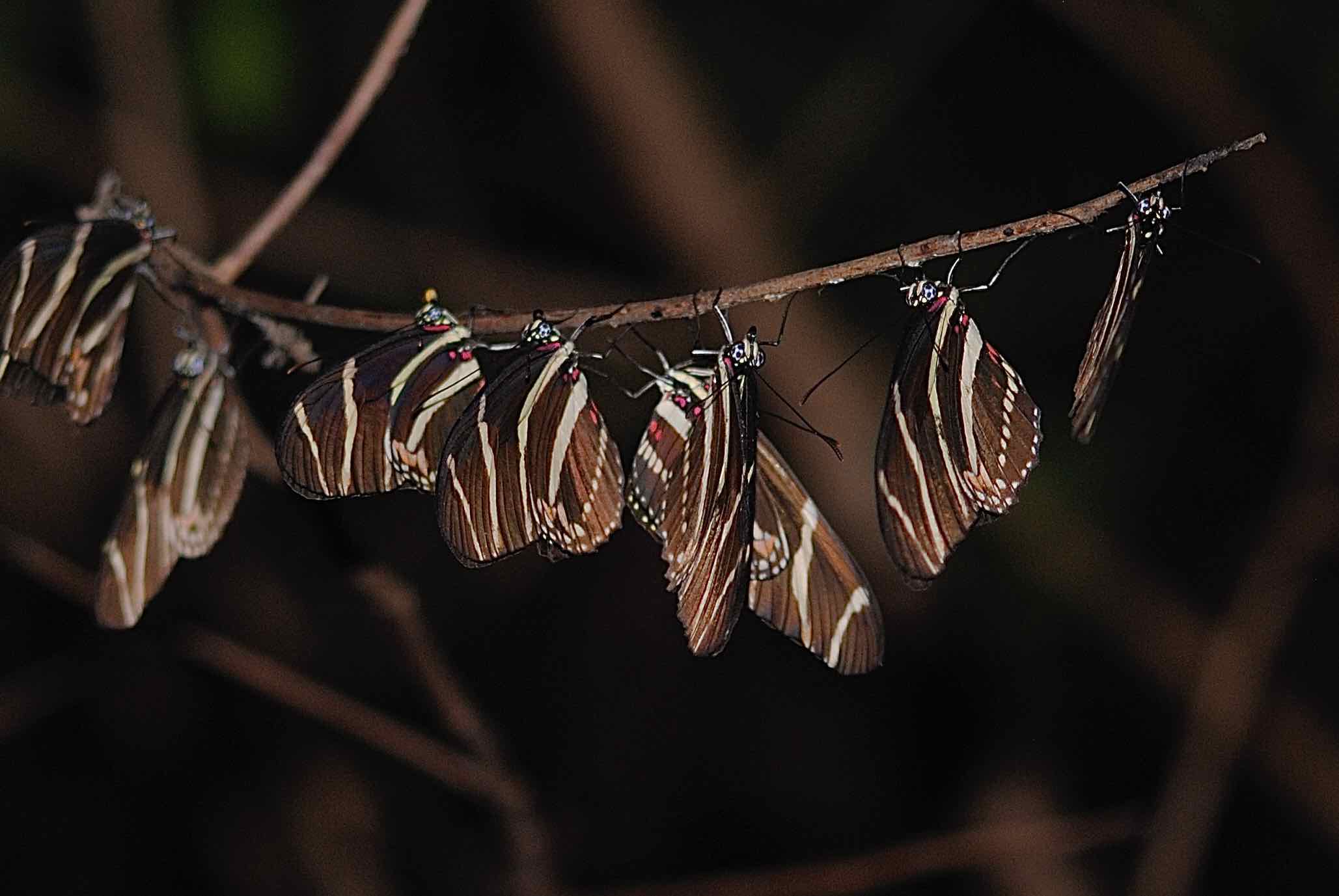 Zebra longwings will return day after day to feed on the same plants, following the same path as the day before, a process called trap lining. Not just the same species; the same individual plants. If a plant happens to be missing, they'll circle around the site as if looking for it. At night, zebras will gather in roosts (see the photo at the bottom left), the oldest among them choosing the site. Come morning, they nudge each other to begin the new day.